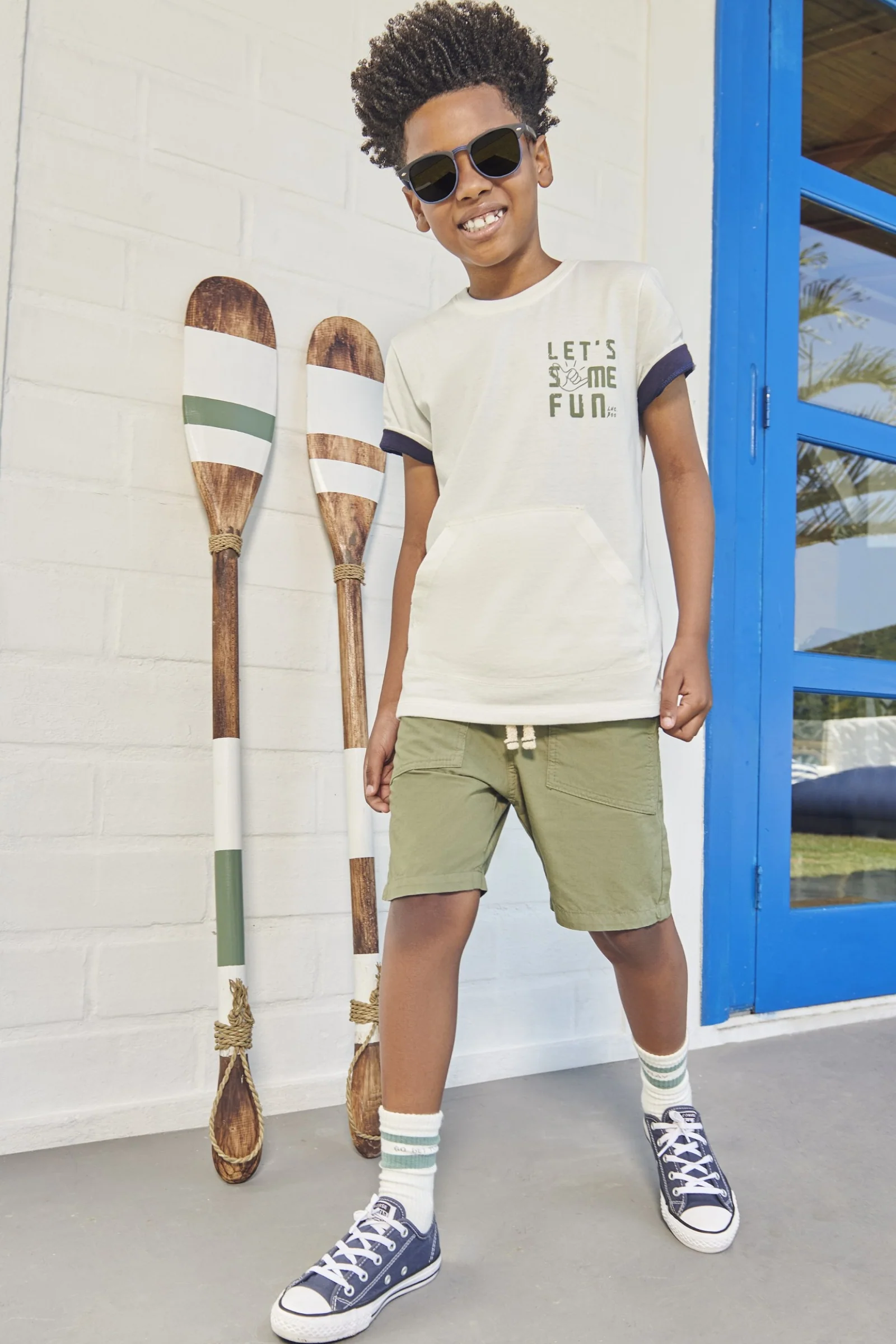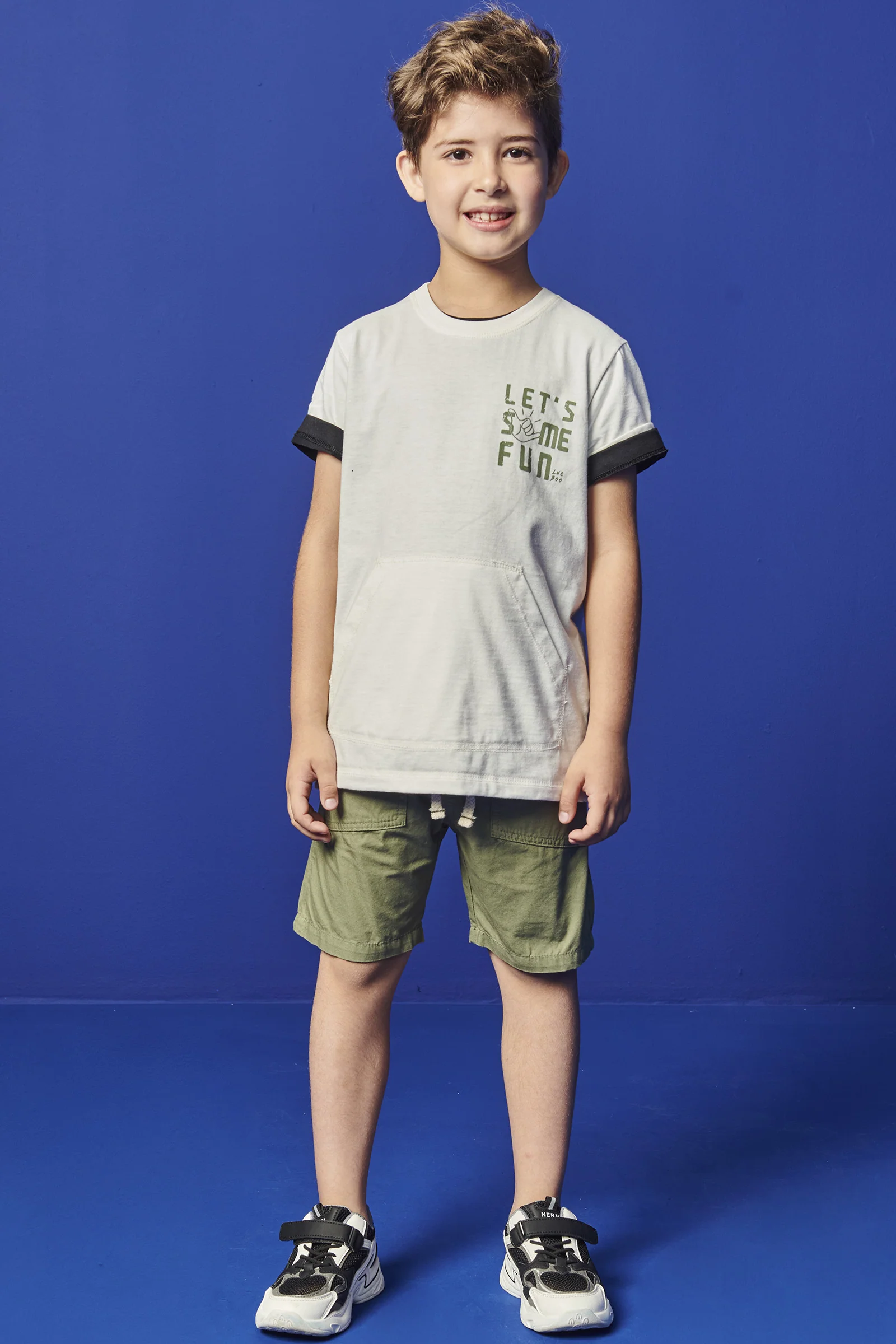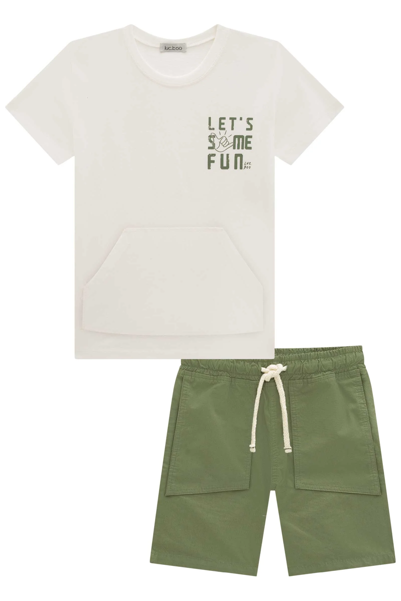 Conjunto infantil confeccionado en algodón brasileño, ideal para días de juego y diversión. Incluye polera blanca con bolsillo tipo canguro y estampado «Let’s have fun», y short verde con pretina elástica y lazo ajustable. Cómodo, fresco y duradero, perfecto para acompañar a los niños en cada aventura.