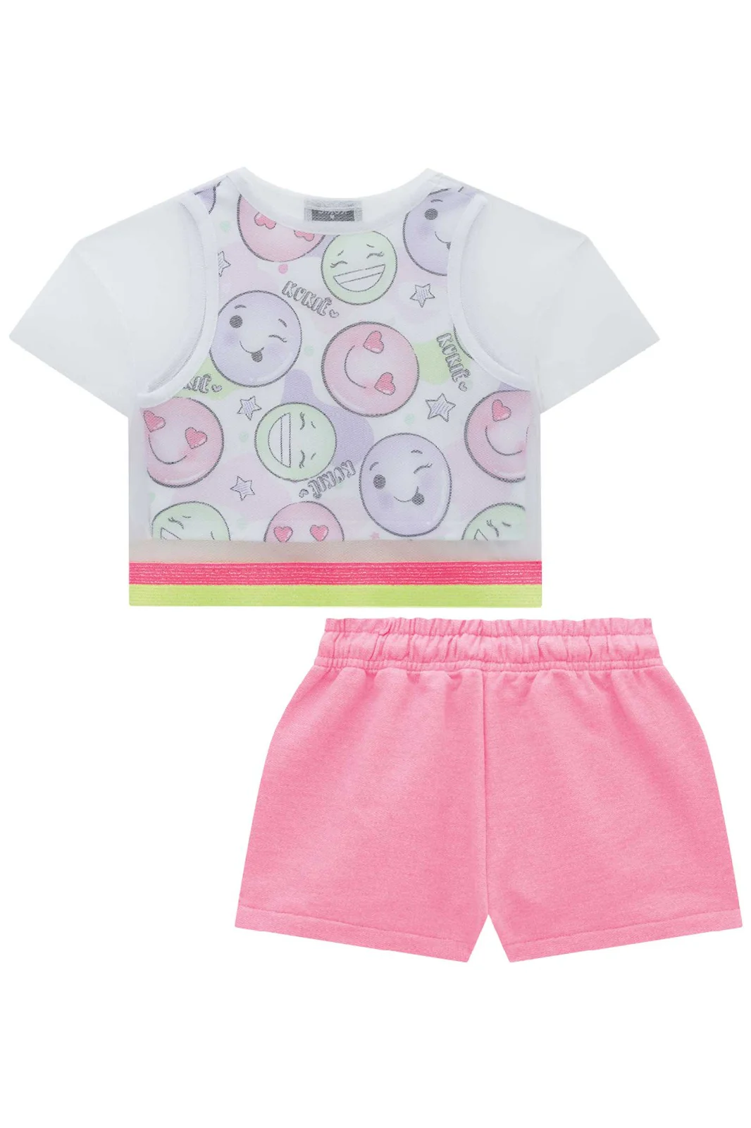 Conjunto Kukie neón para niña, ideal para looks llenos de color y estilo esta temporada. Incluye polera blanca con diseño de caritas divertidas y detalles de tul, junto a un short rosa neón con cintura elástica y cordón decorativo. Confección brasileña de alta calidad, suave, fresca y cómoda para el día a día o actividades al aire libre. ¡Un conjunto que destaca por su originalidad y alegría!