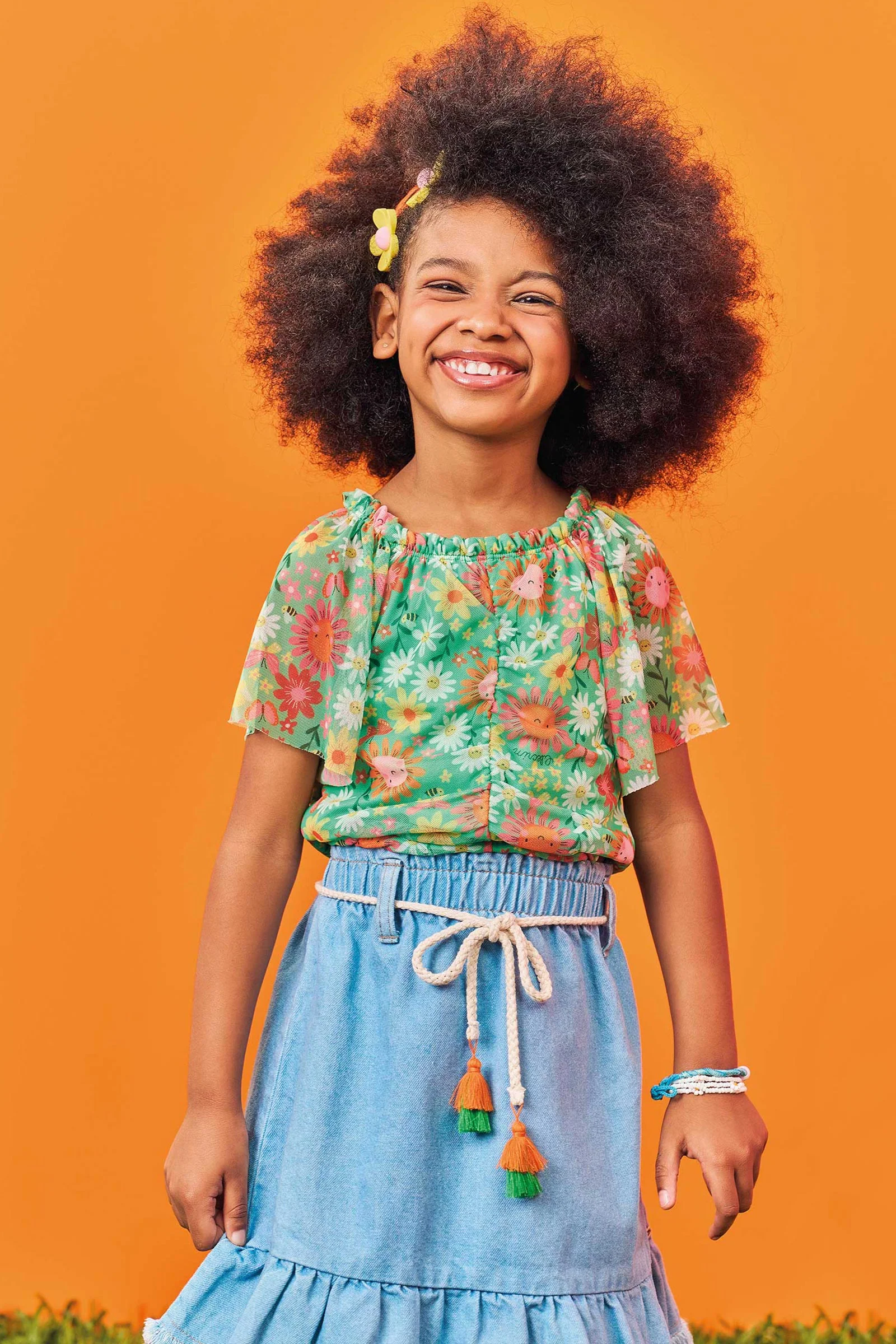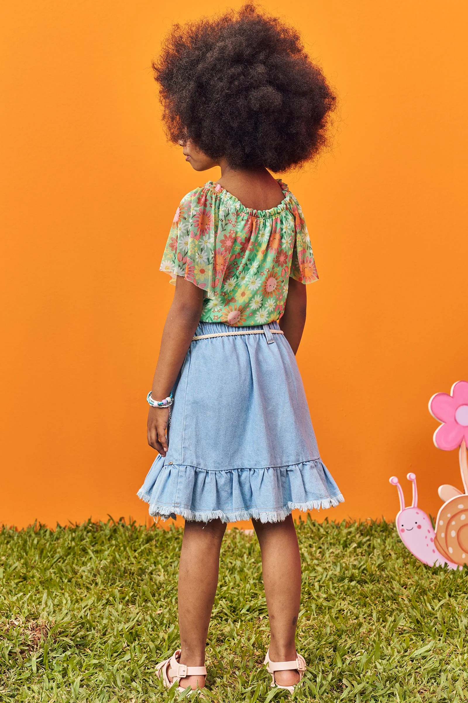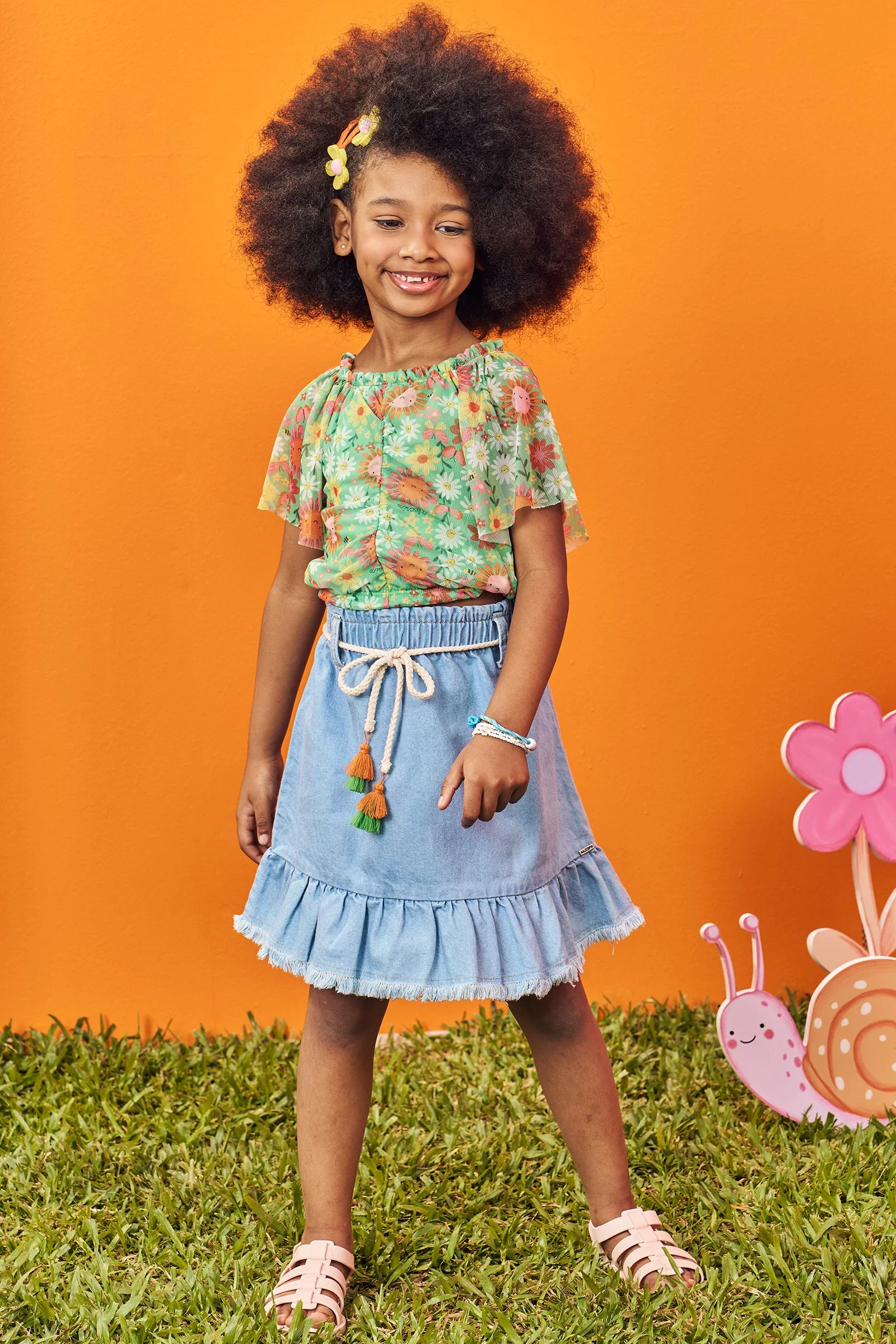 Conjunto para niña, polera con un hermoso estampado floral y falda de mezclilla con detalles de flecos y cordón, ideal también para combinar con cualquier outfit. Disponible en tallas desde 4 a 14 años. Perfecto para un look veraniego y colorido, tanto para ocasiones especiales y días de diversión