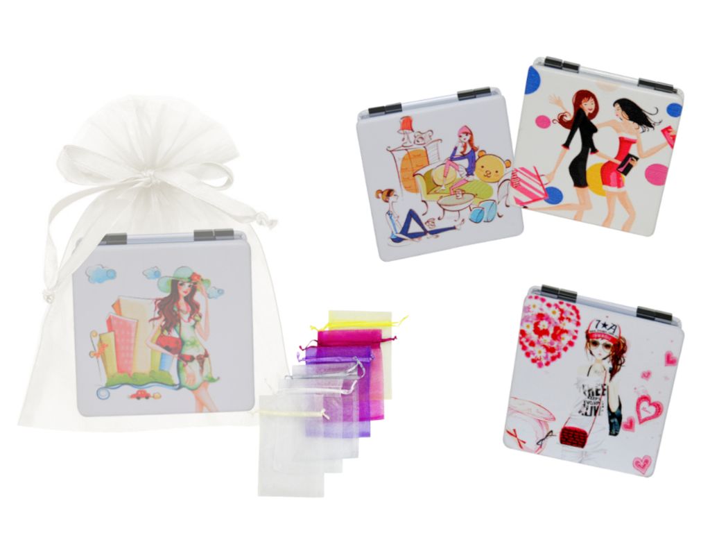 Espejo de piel cuadrado chicas + bolsa tul, Regalo ideal y original para los invitados de tu boda.