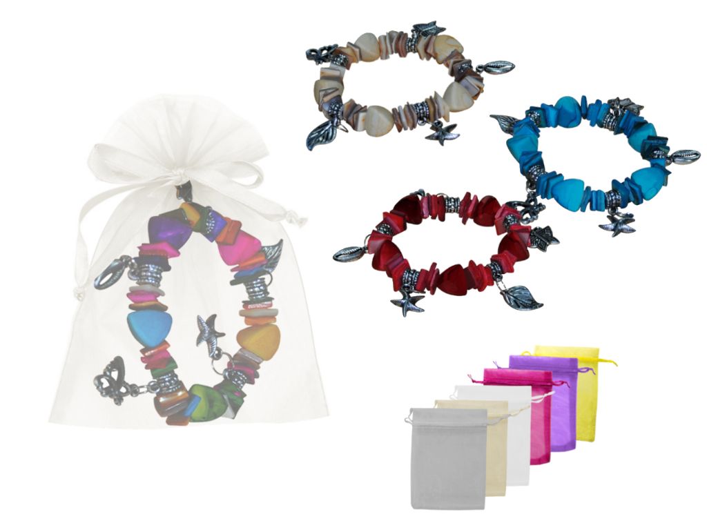 Pulsera de nacar con abalorios + bolsa de tul, Regalo ideal y original para los invitados de tu boda.