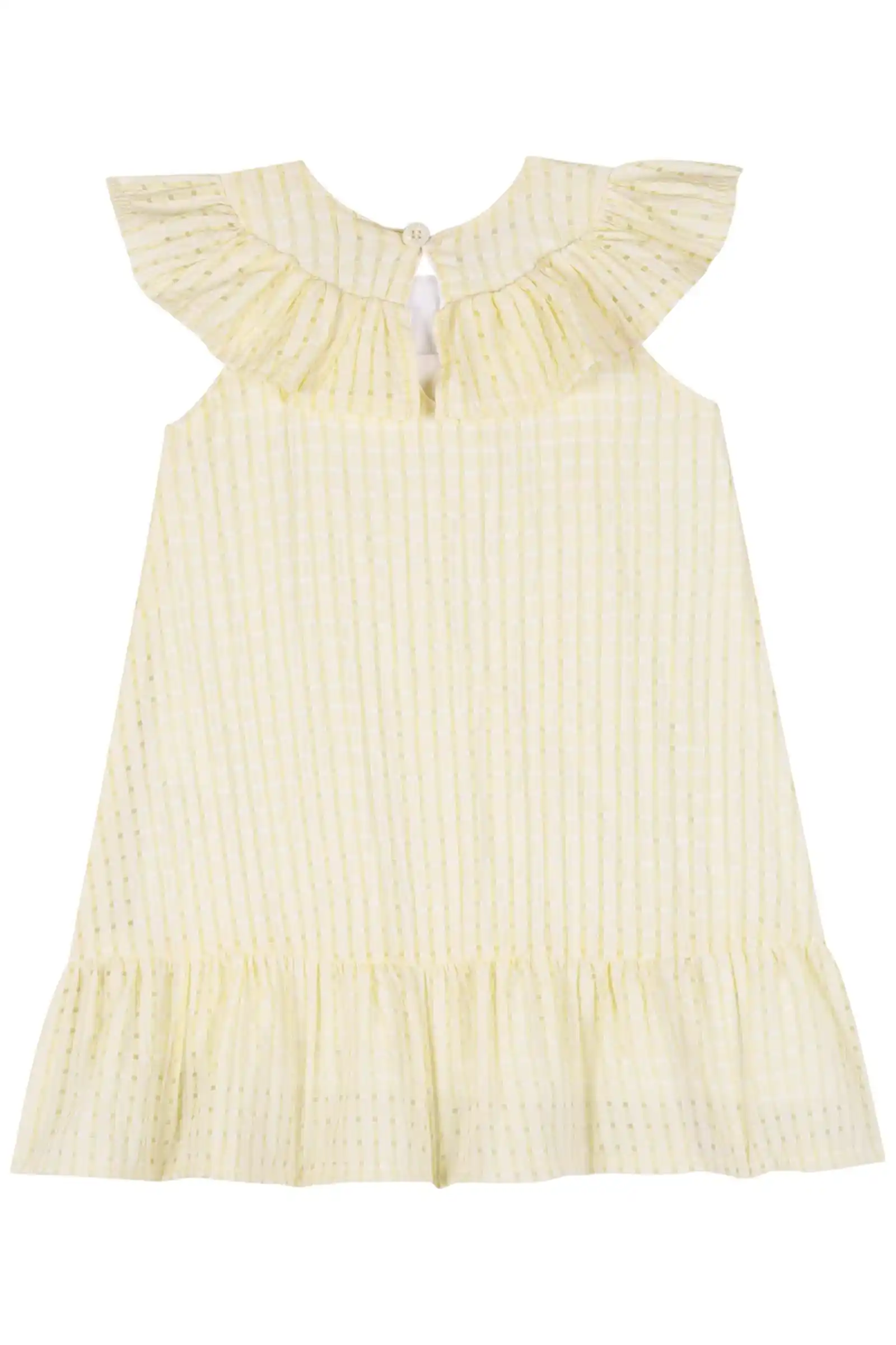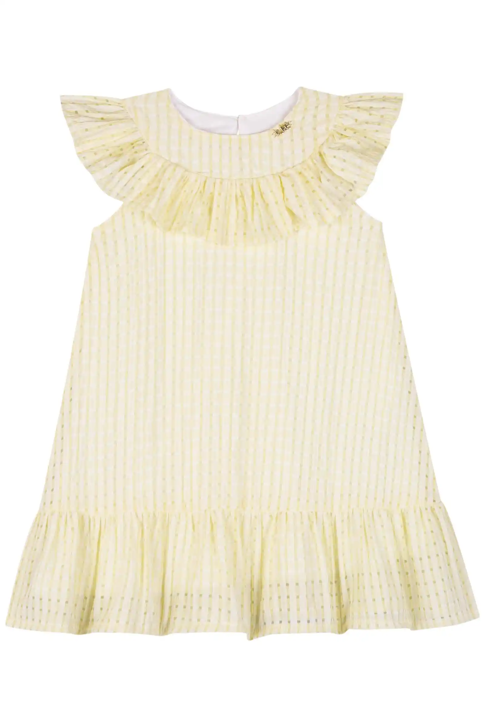 El vestido amarillo con volantes de Kukie combina frescura, delicadeza y estilo en una prenda ideal para días soleados, celebraciones o looks cómodos y elegantes. Su diseño con textura en rayas, cuello con volante amplio y ruedo con vuelo crea un efecto ligero y encantador.