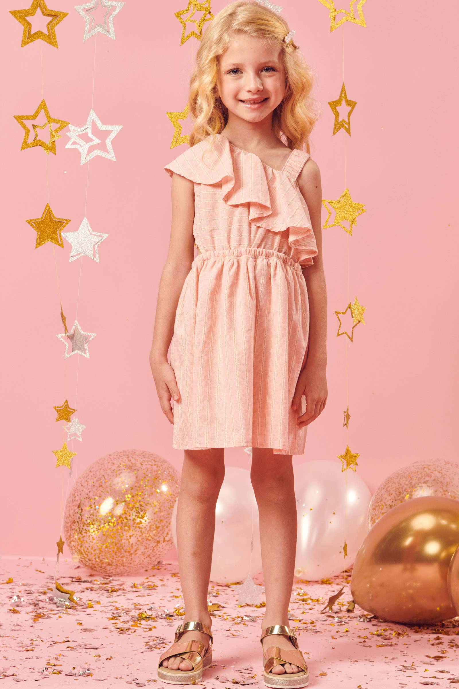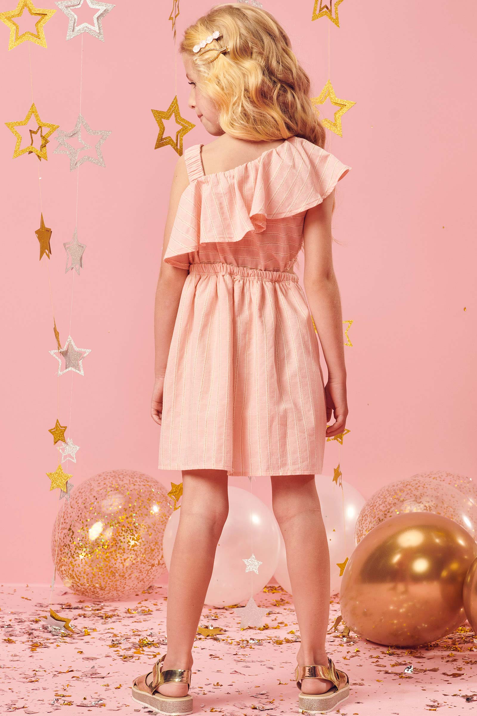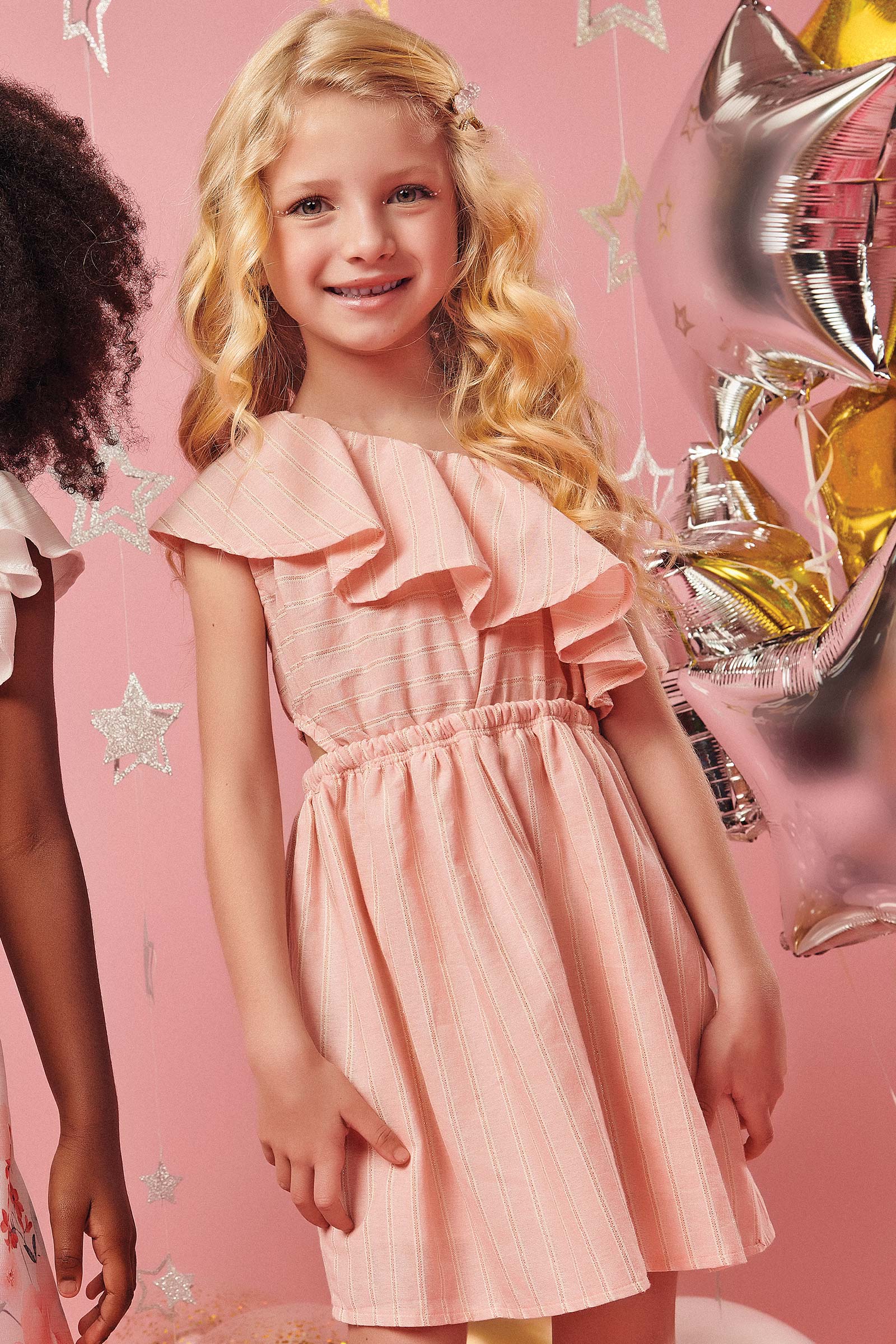 Vestido asimétrico Kukie para niñas, con elegante volante en el escote y tirante fruncido. Confeccionado en tela suave de rayas con brillo sutil, es ideal para ocasiones especiales o celebraciones de verano. Cintura elasticada para mayor comodidad y calce perfecto. Disponible en rosado y celeste, en tallas desde 2 a 12 años. Una prenda fresca, cómoda y encantadora para destacar con estilo. ¡Perfecto para cumpleaños, fotos y días especiales!