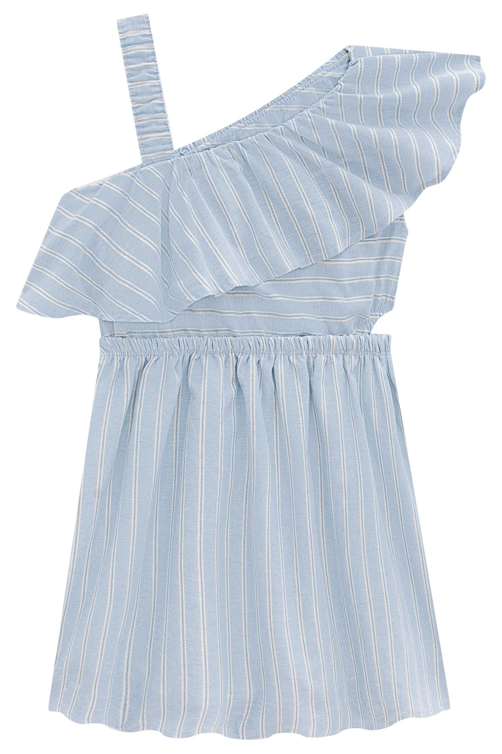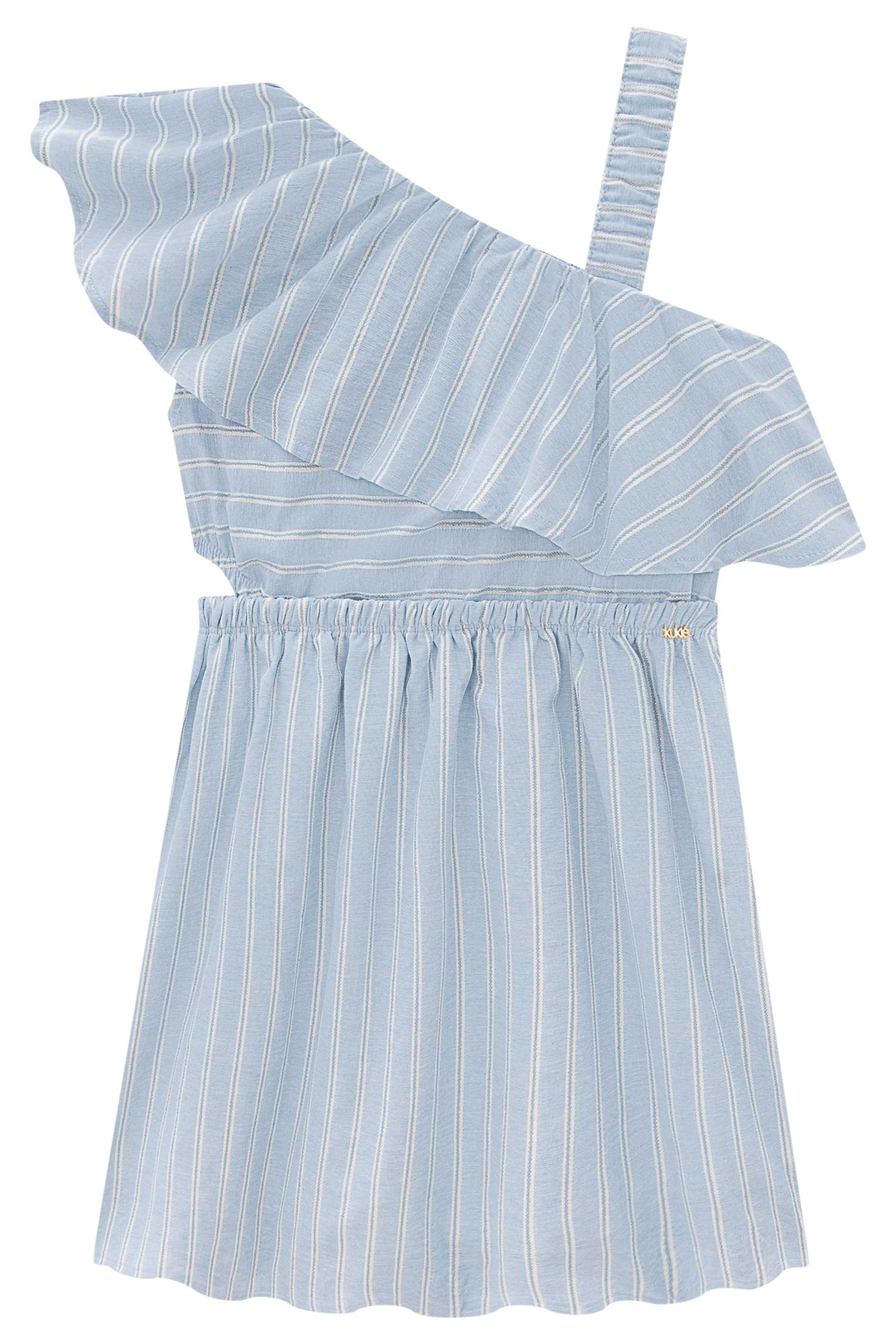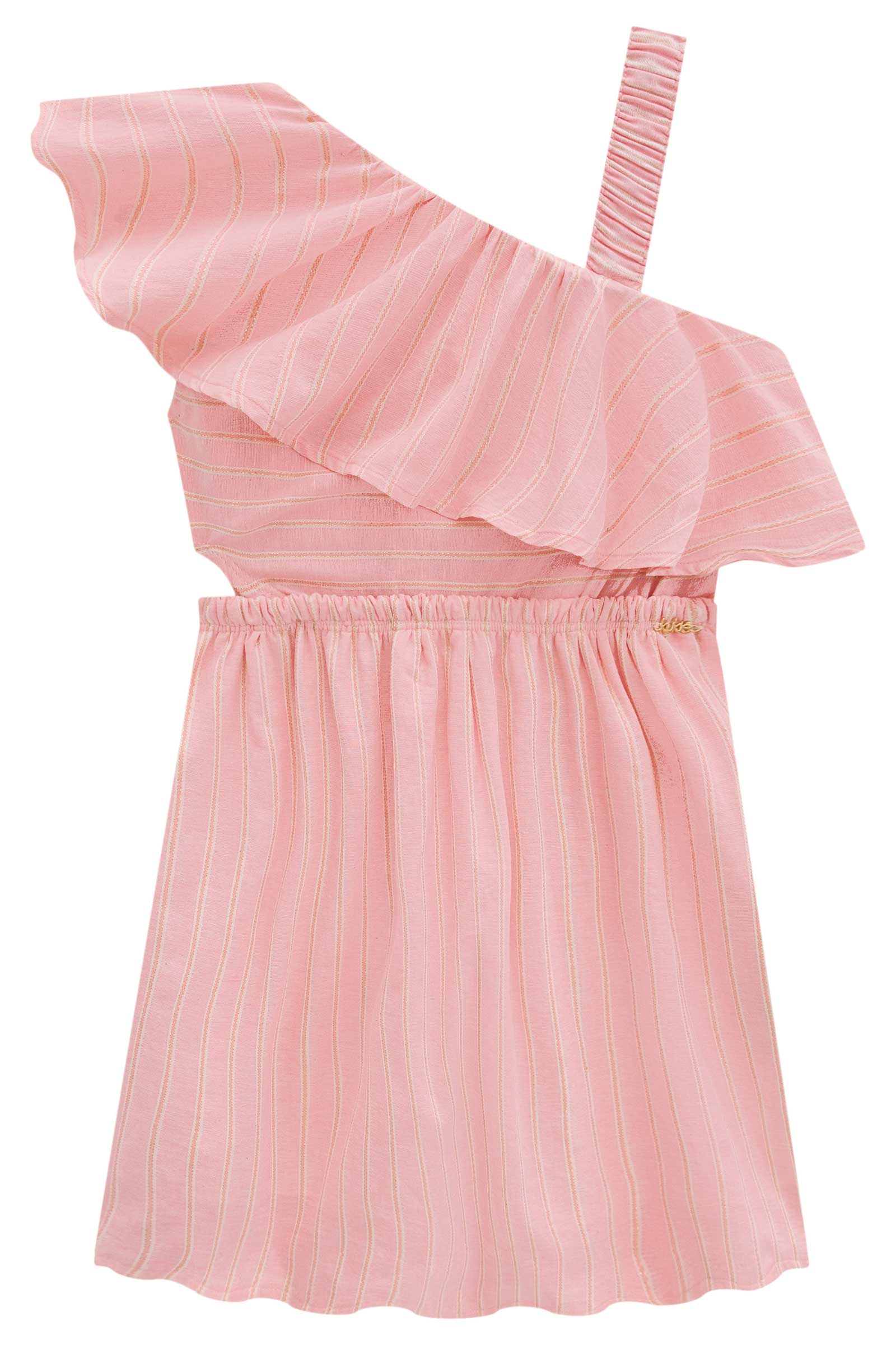 Vestido asimétrico Kukie para niñas, con elegante volante en el escote y tirante fruncido. Confeccionado en tela suave de rayas con brillo sutil, es ideal para ocasiones especiales o celebraciones de verano. Cintura elasticada para mayor comodidad y calce perfecto. Disponible en rosado y celeste, en tallas desde 2 a 12 años. Una prenda fresca, cómoda y encantadora para destacar con estilo. ¡Perfecto para cumpleaños, fotos y días especiales!