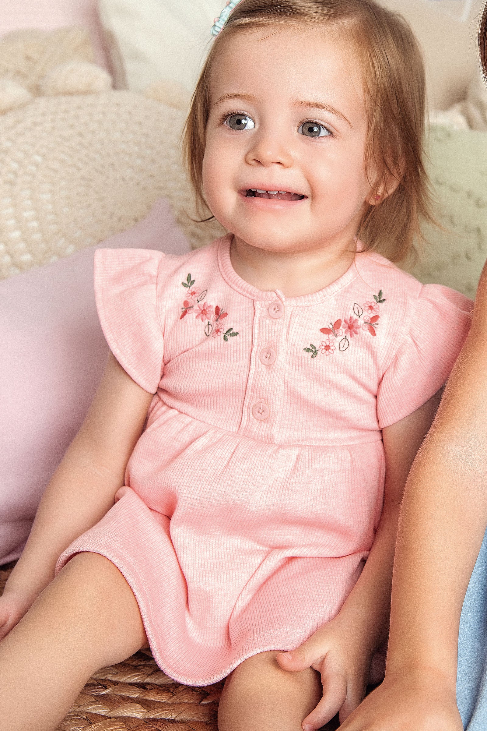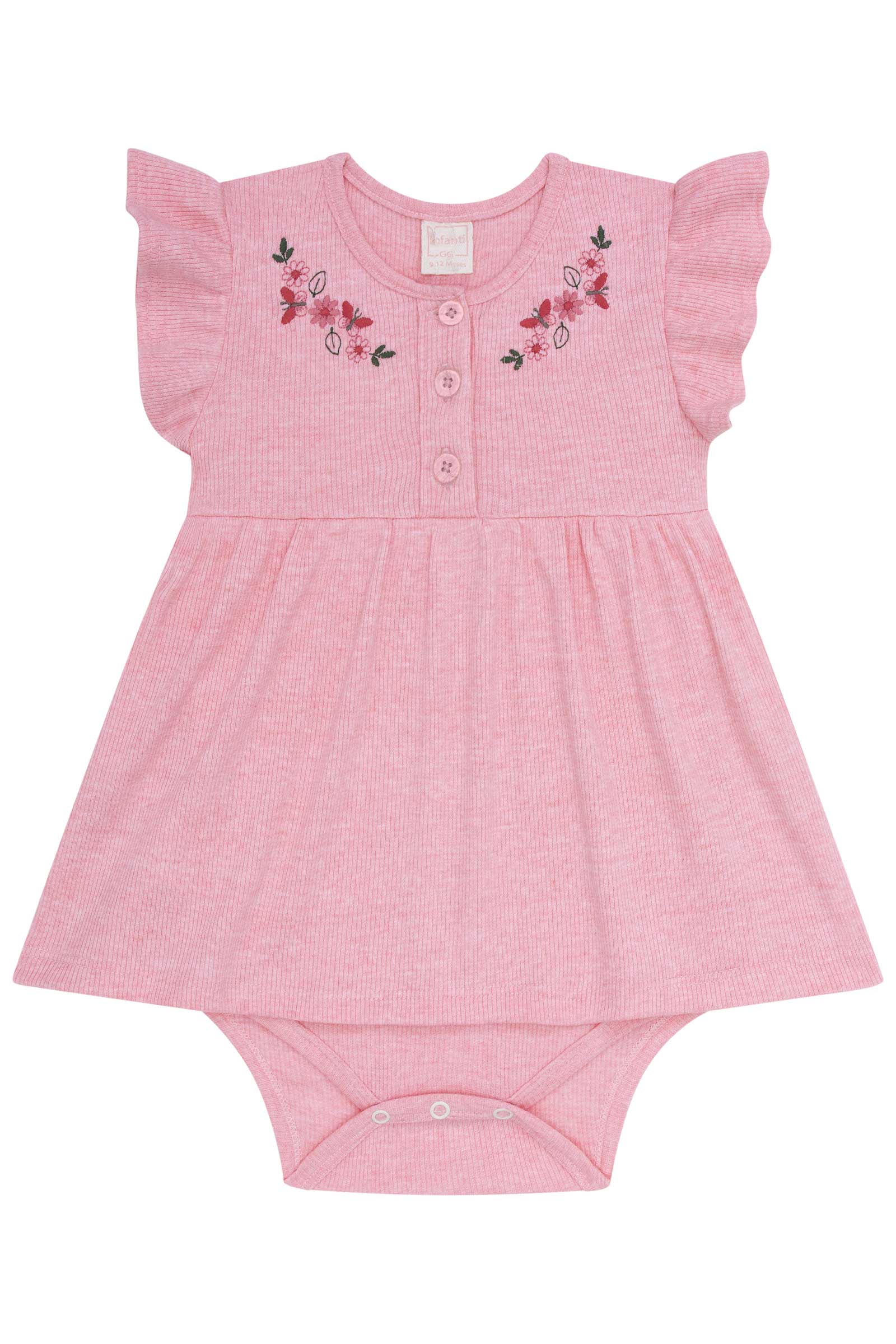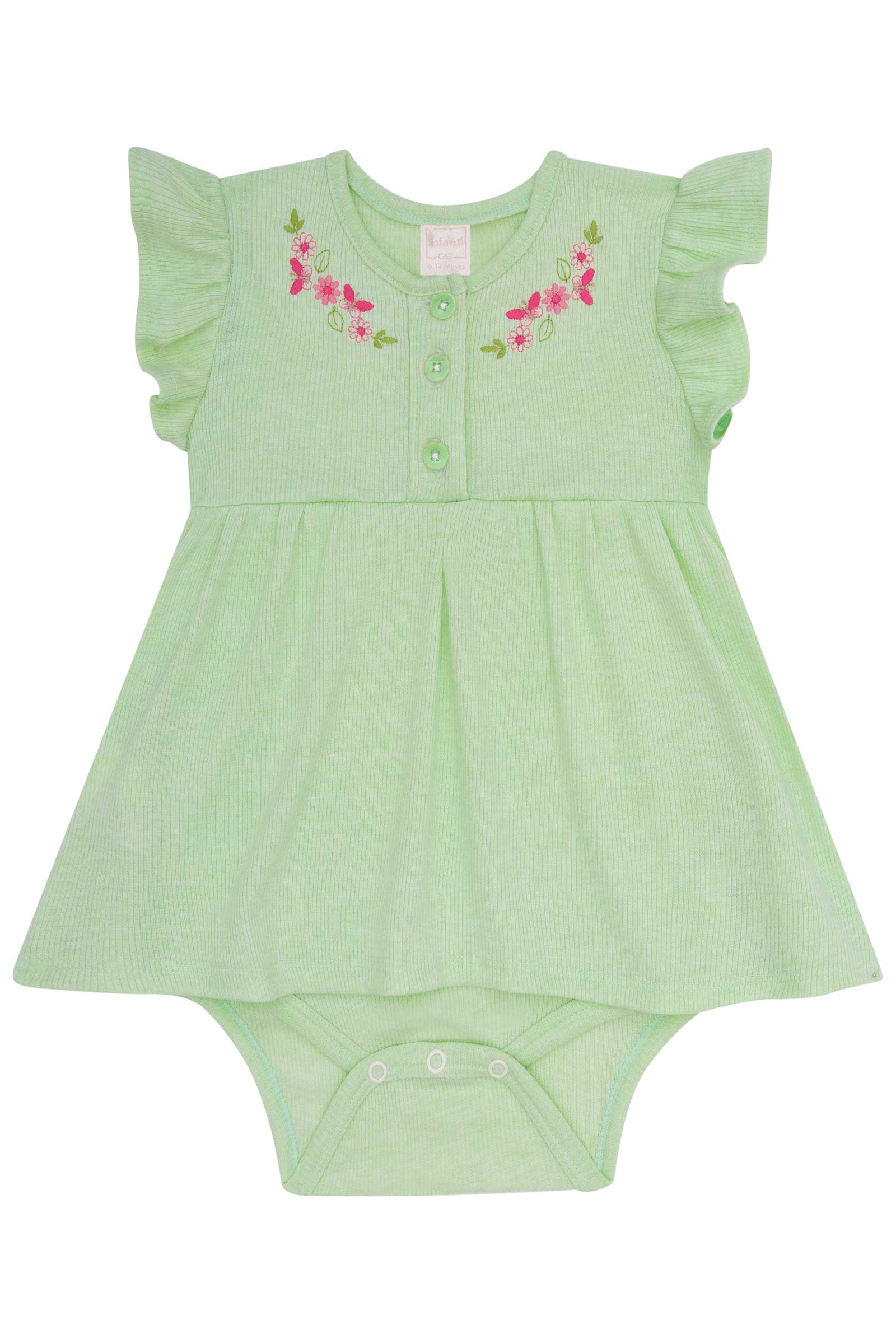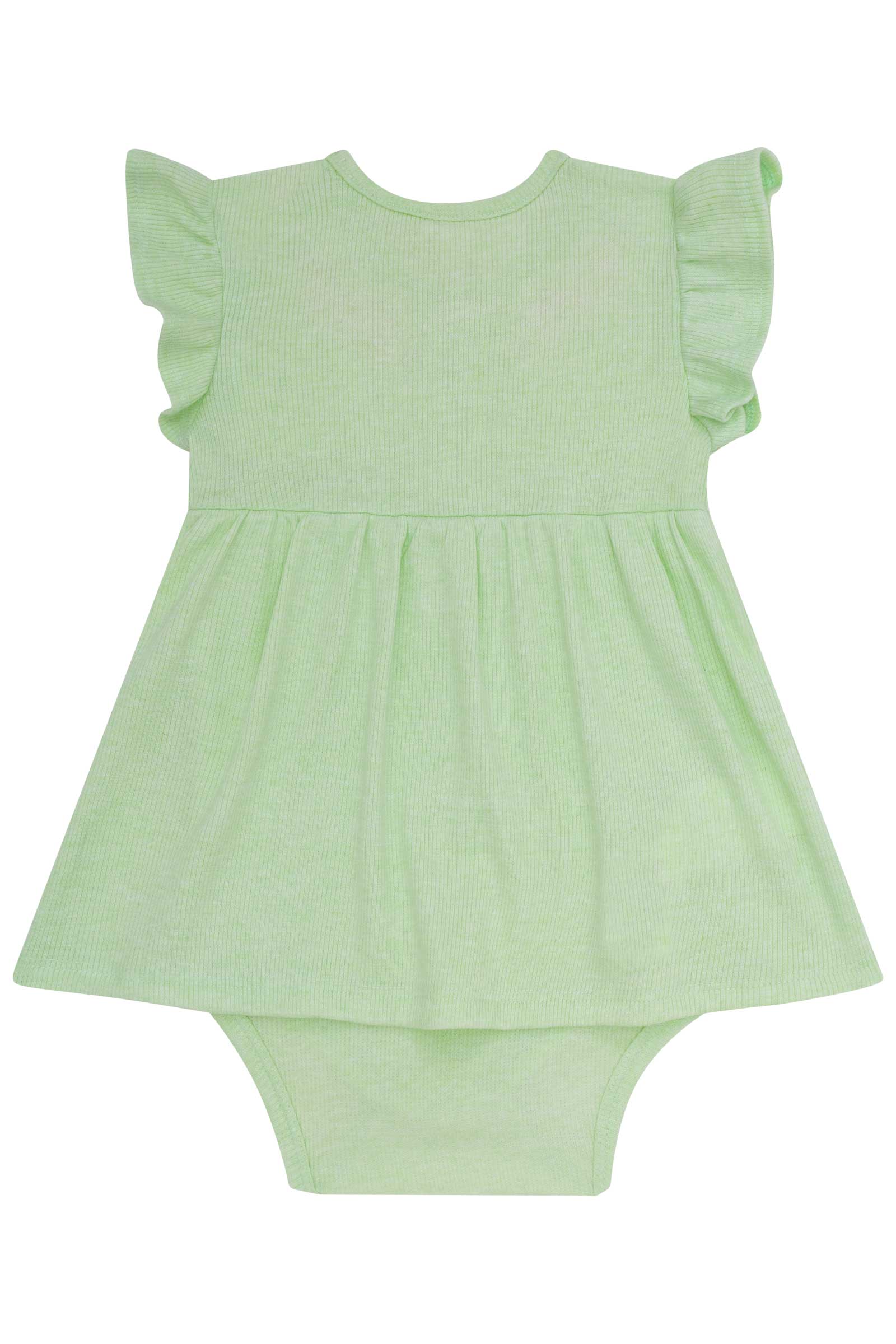 Vestido body para en tonos pastel con detalles florales y volados delicados. Confección de alta calidad brasileña, suave y cómoda para la piel sensible del bebé. Ideal para andar fresquitas en los días de verano.