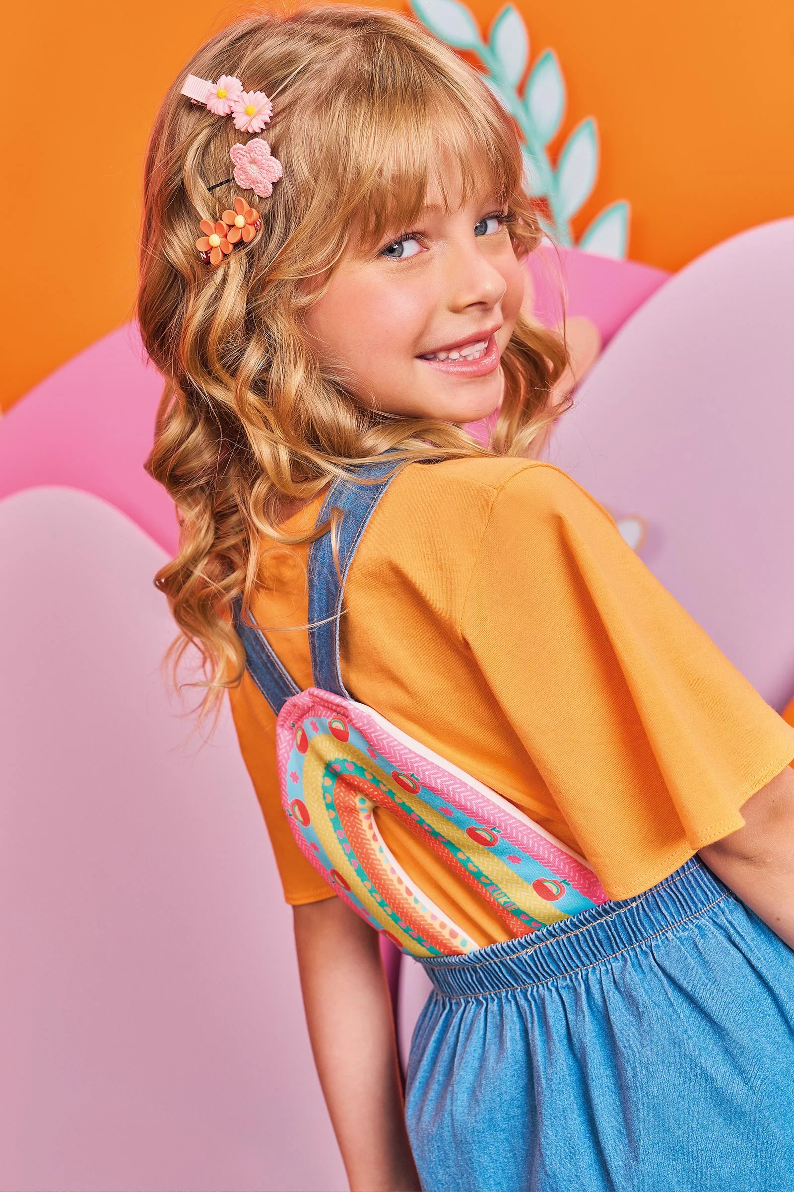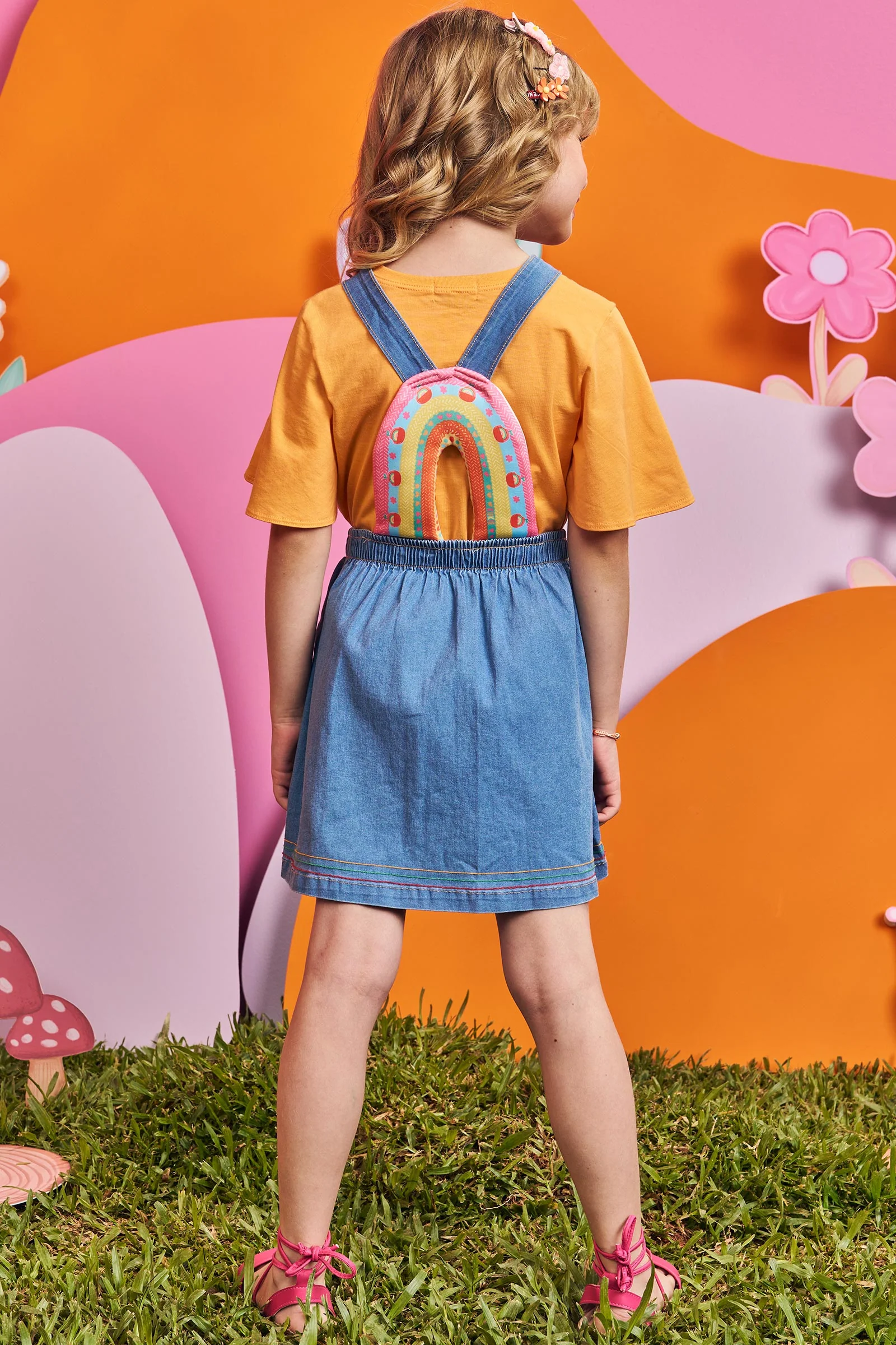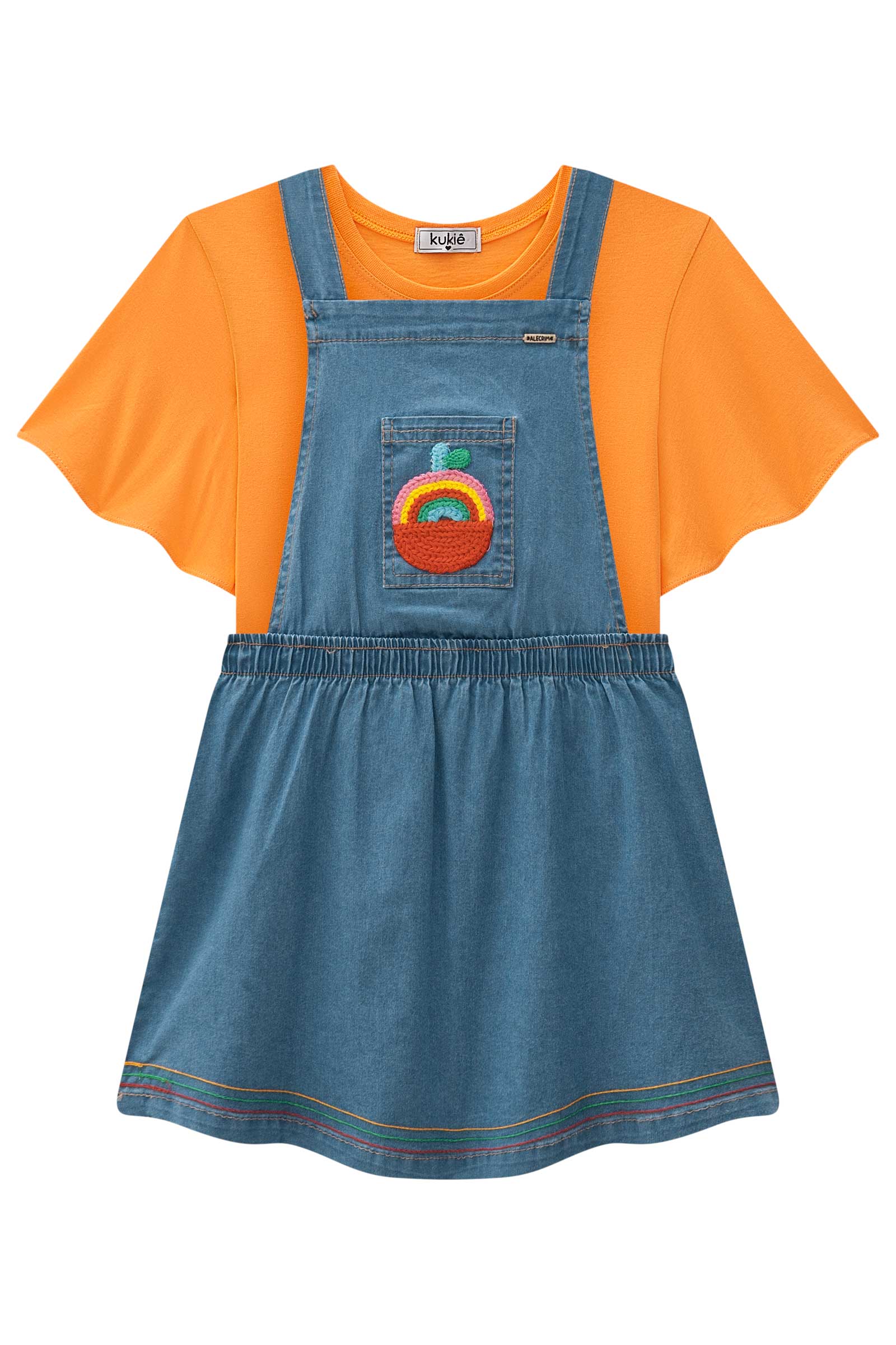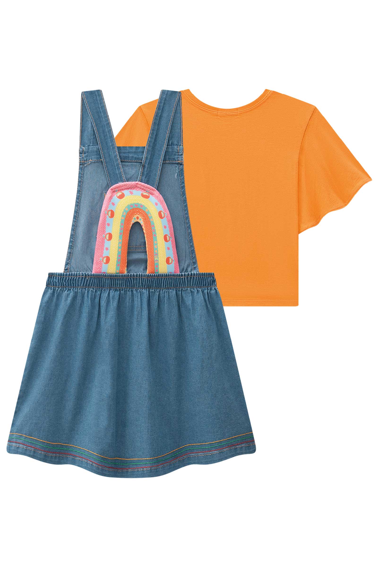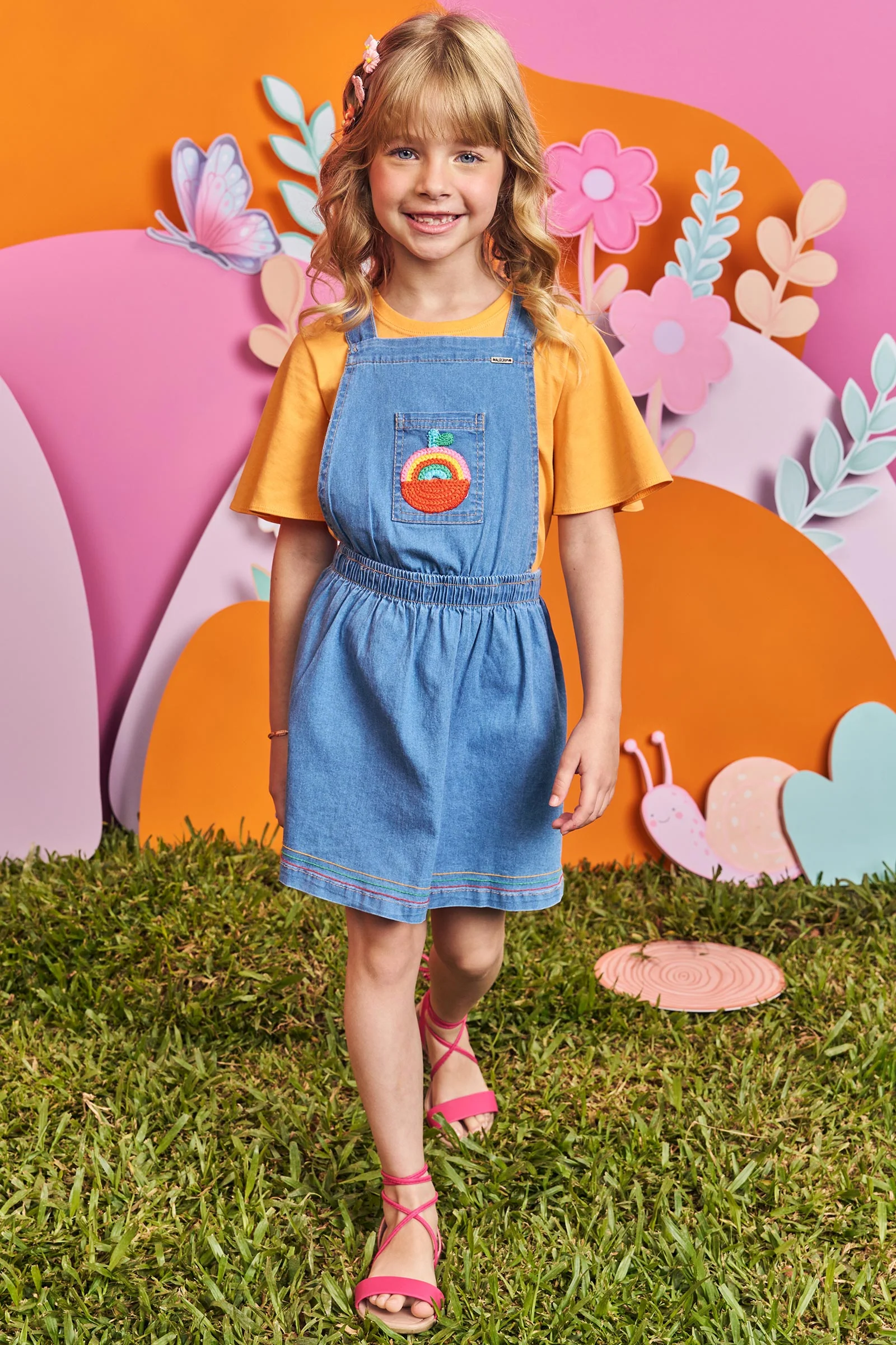 Conjunto para niñas que incluye un encantador vestido de mezclilla con un hermoso bordado de arcoíris en la espalda y una polera de manga corta color naranja. Ideal para el verano, este conjunto es cómodo y colorido, perfecto para cualquier ocasión. Cada prenda puede combinarse fácilmente con otras piezas, ofreciendo versatilidad y estilo. Disponible en tallas de 2 a 8 años. Confección brasilera
