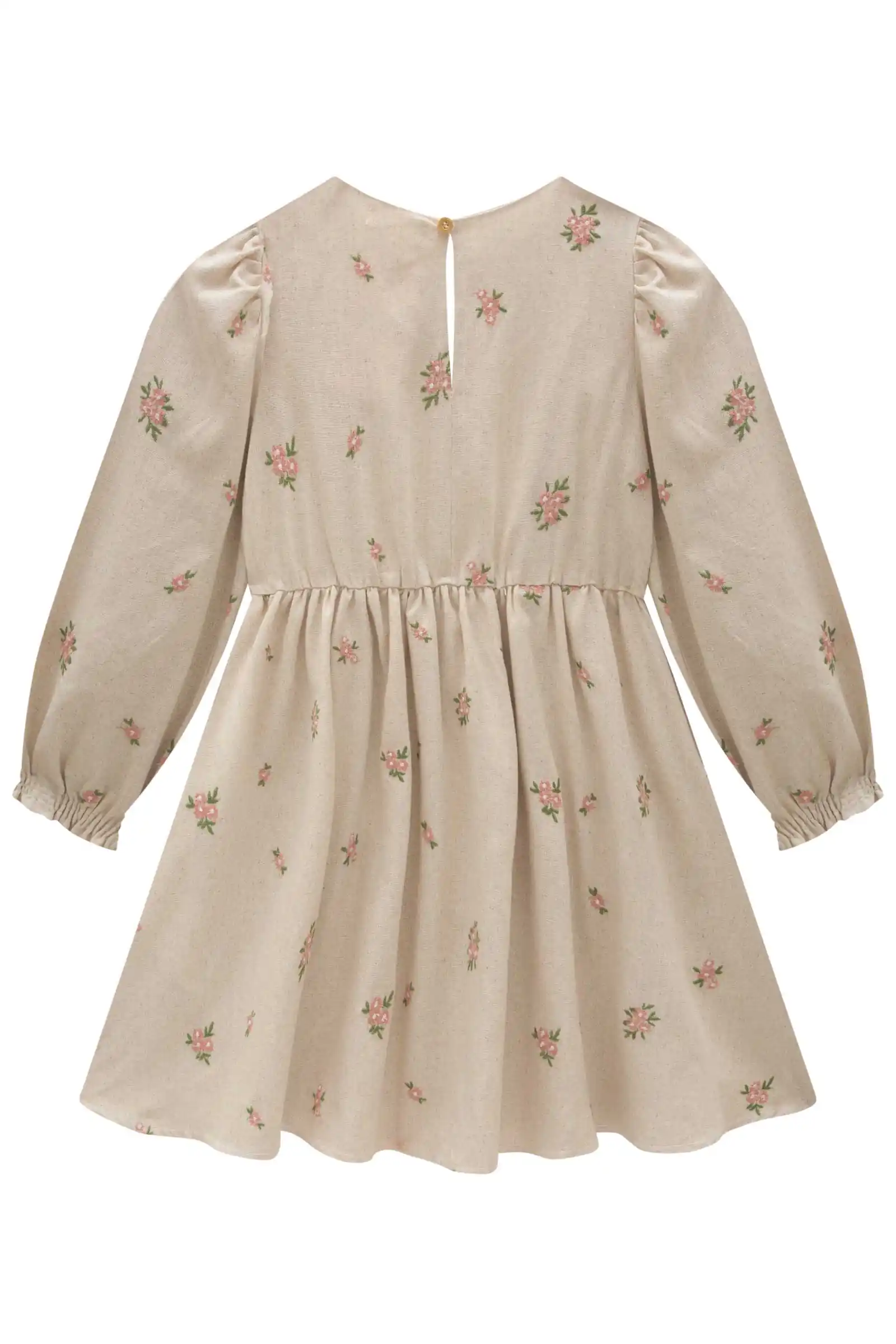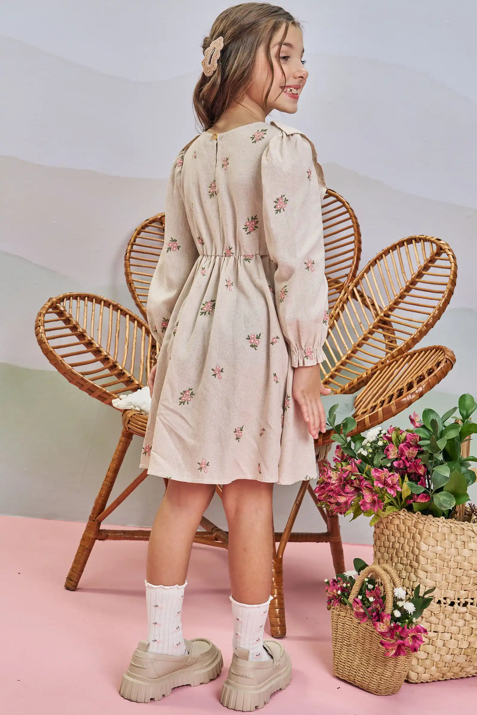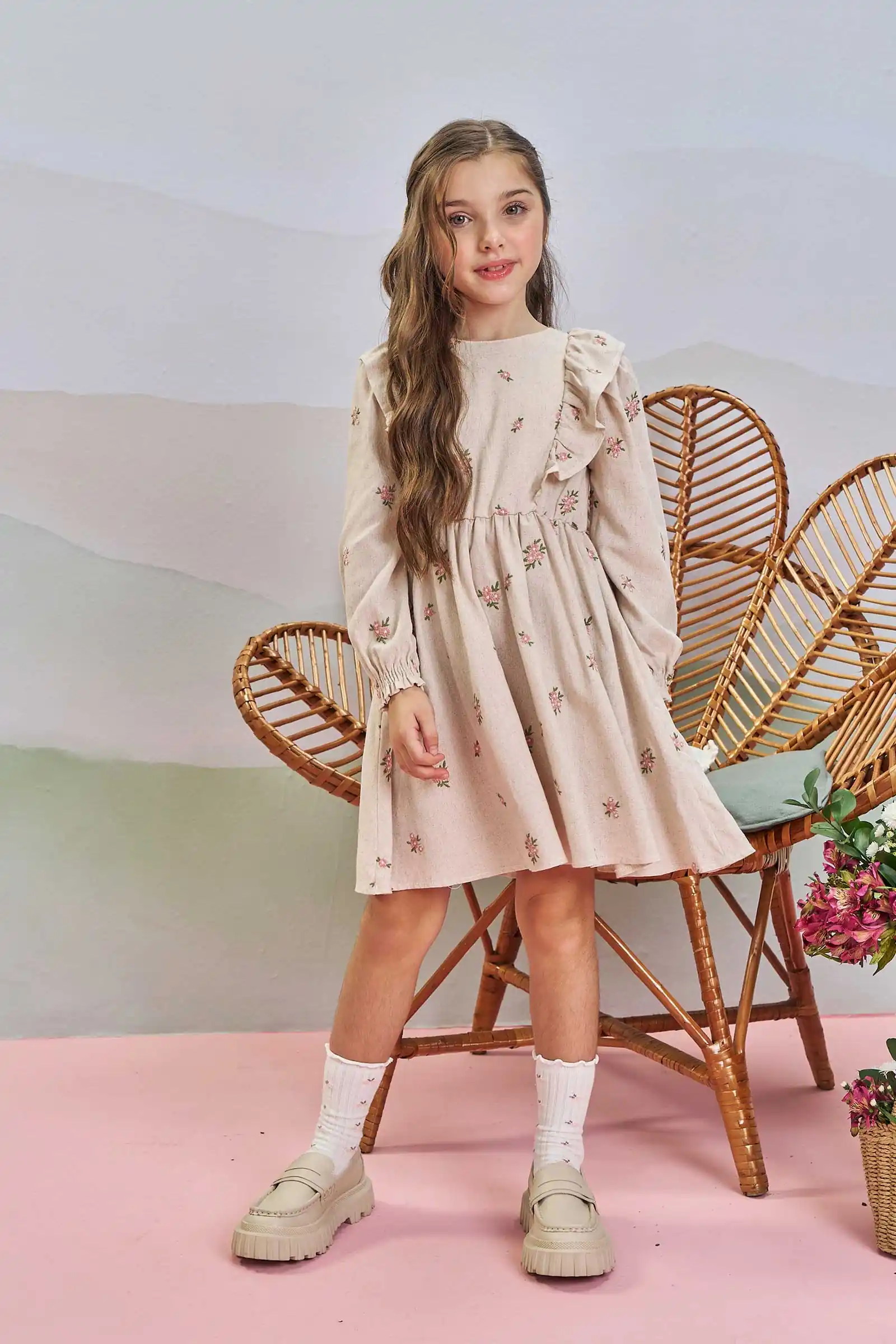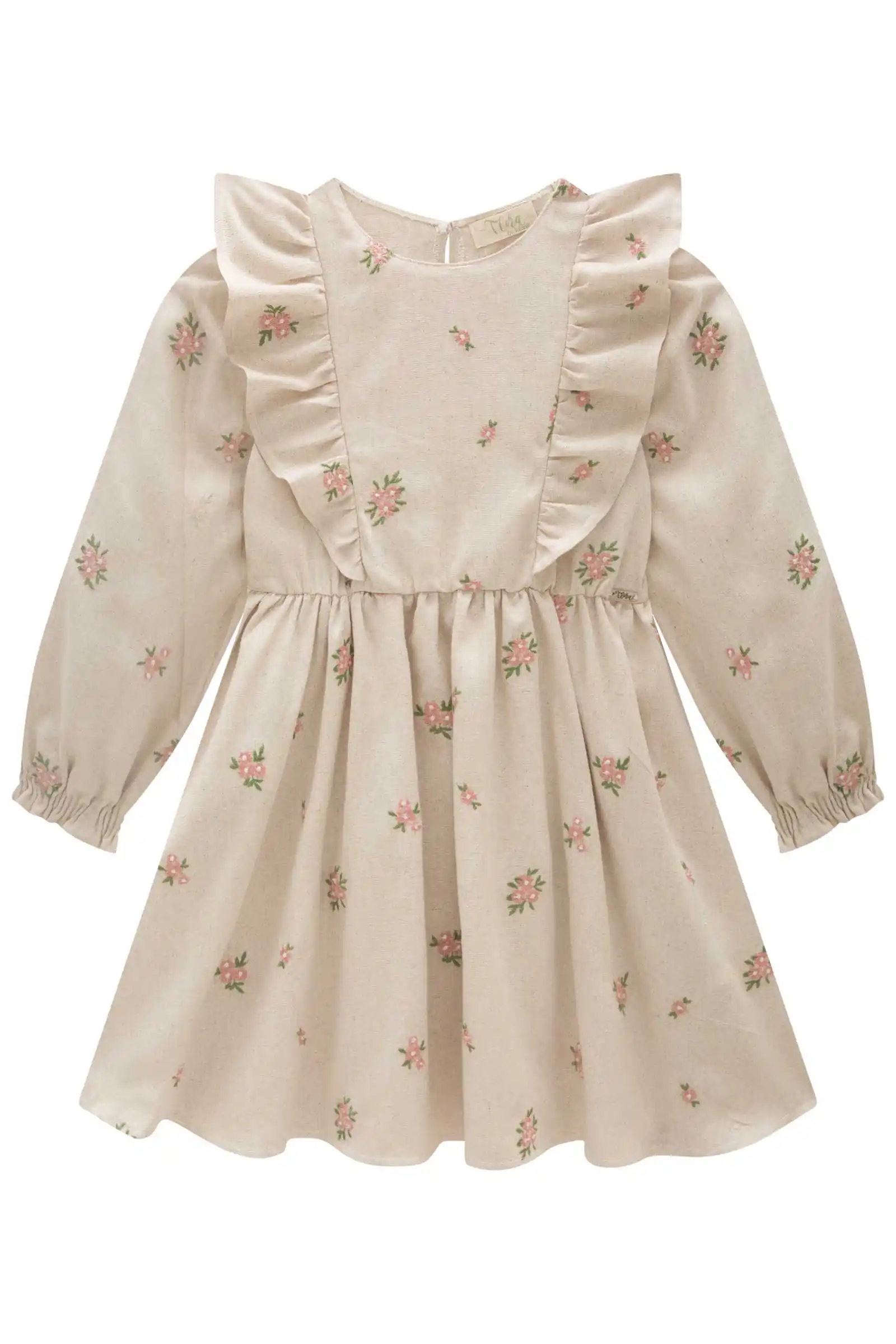 Vestido beige de manga larga con delicado estampado floral en tonos delicados, ideal para las niñas que aman un look romántico y femenino. Cuenta con volantes decorativos en el pecho y espalda, y puños elasticados para un calce perfecto. Confección brasileña de alta calidad, suave, cómodo y perfecto para ocasiones especiales. Una prenda realmente hermosa.