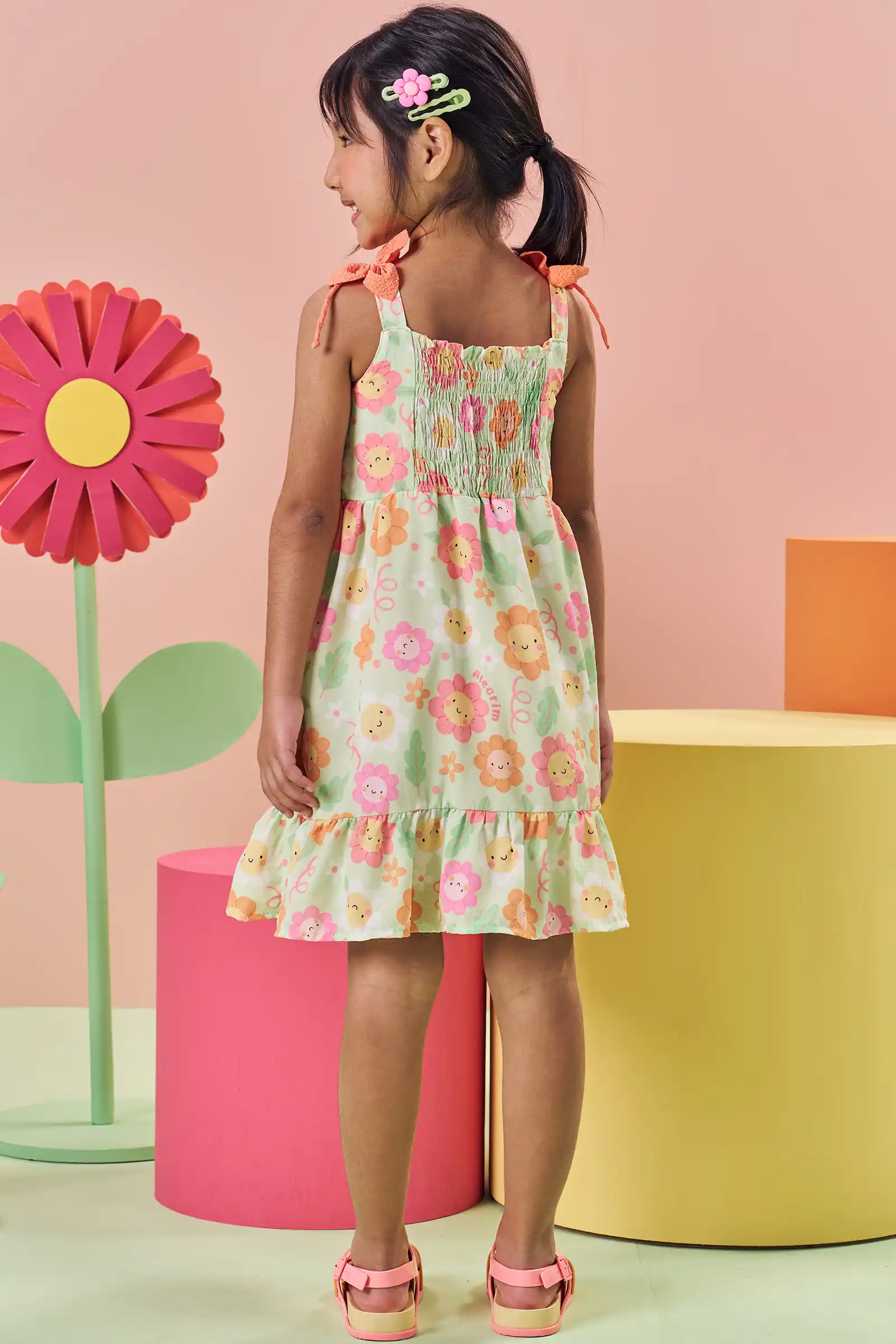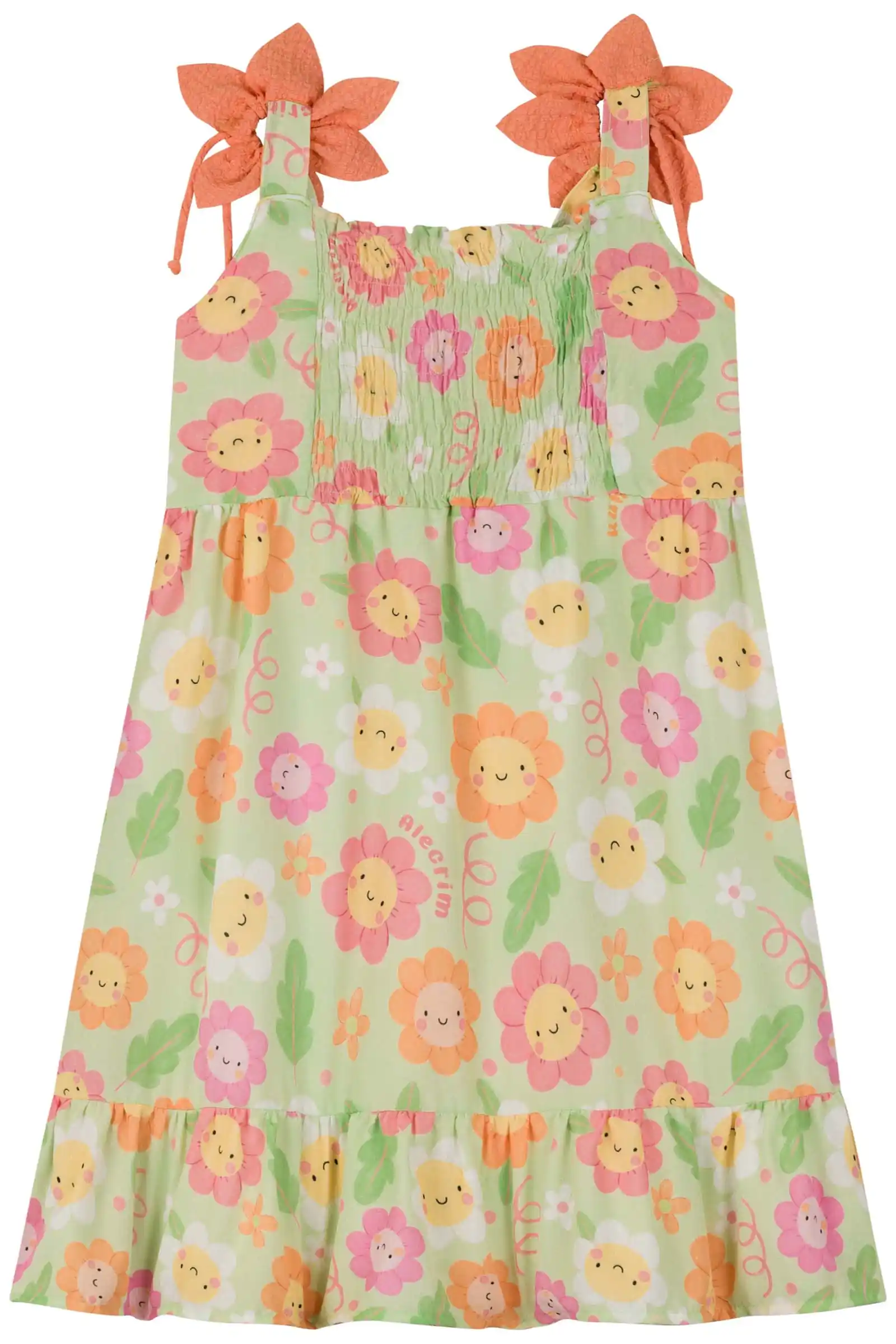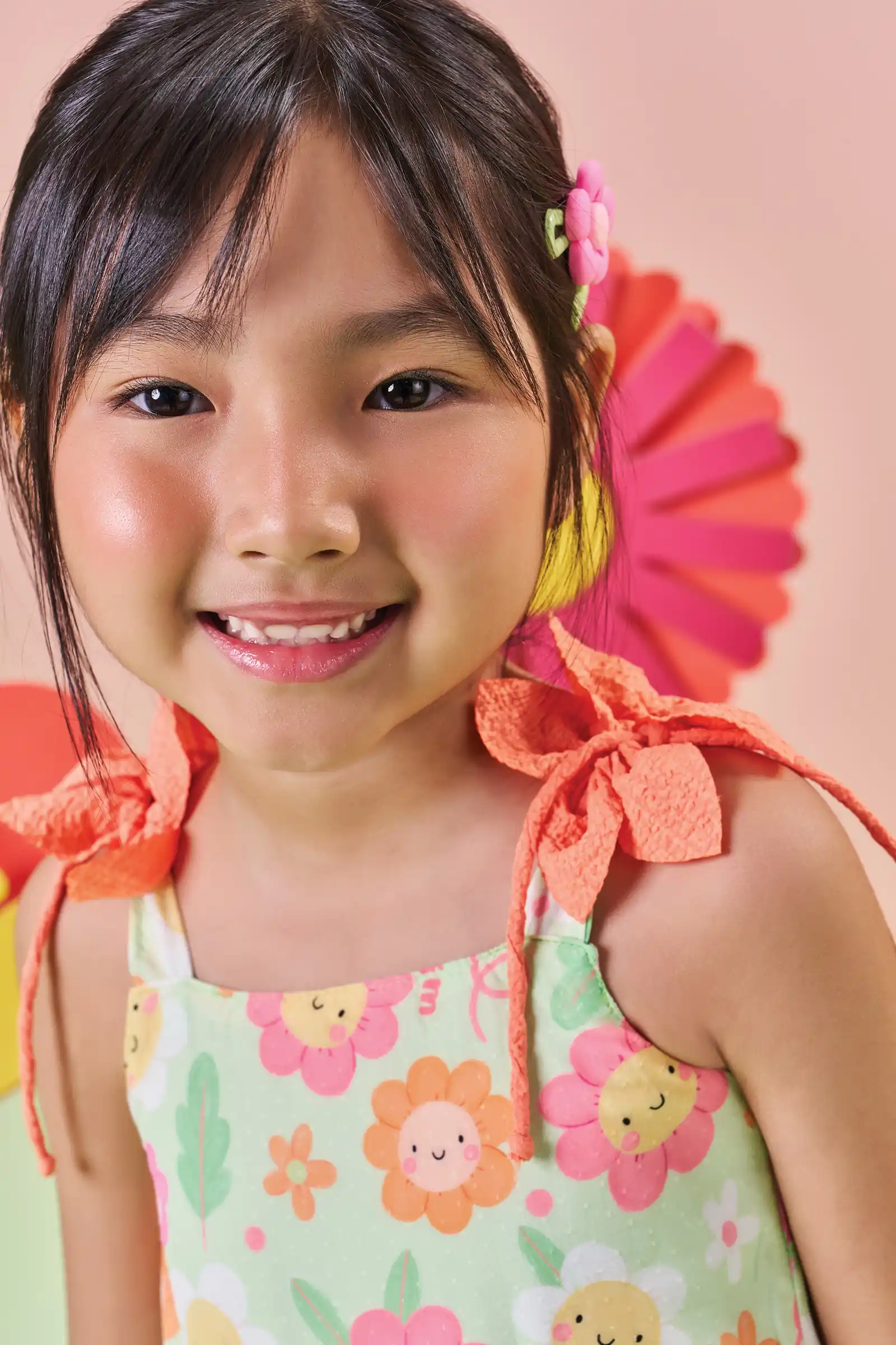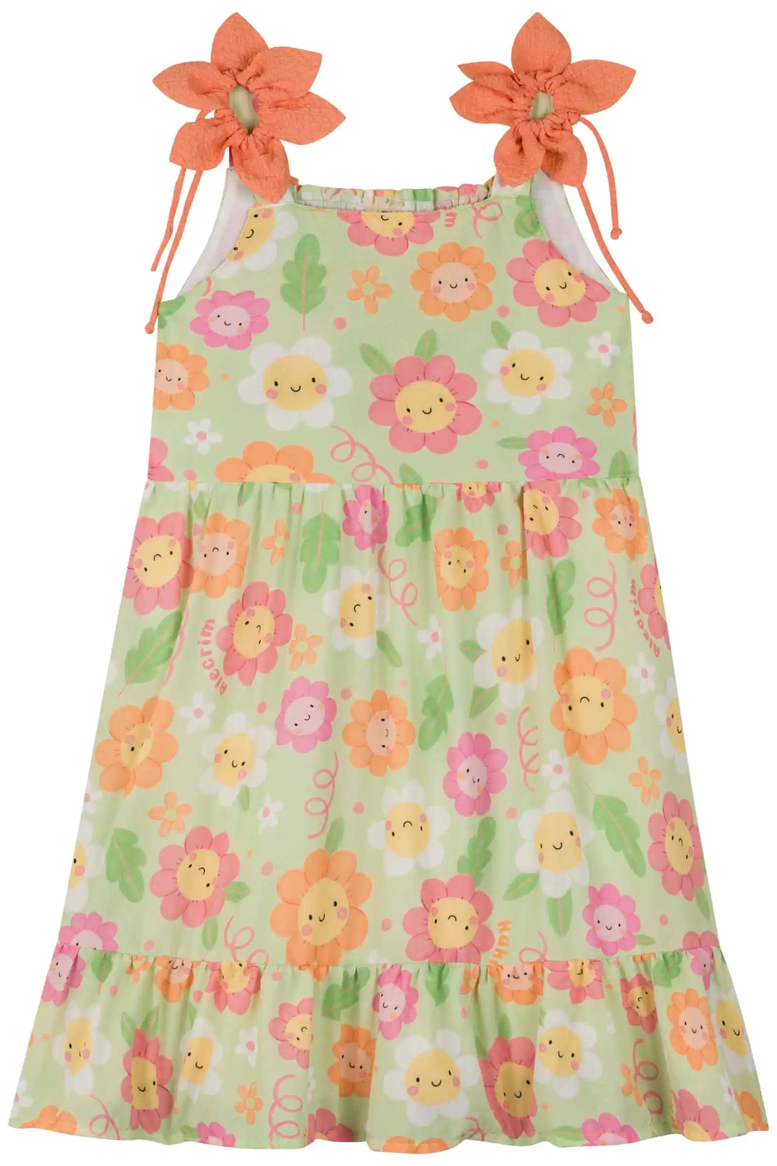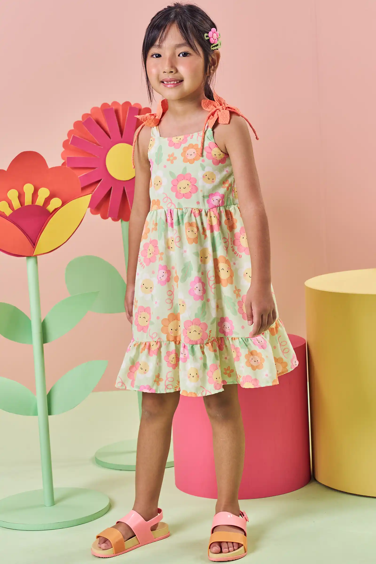 Dulzura, color y comodidad en un solo vestido. El Vestido Floral Verde Kukie está confeccionado en suave algodón brasileño y destaca por su diseño encantador con tirantes ajustables en forma de flor, un toque único que encanta a niñas y mamás. Su print lleno de flores sonrientes aporta alegría, mientras que la falda con vuelo lo hace cómodo para jugar, pasear o usar en días soleados.