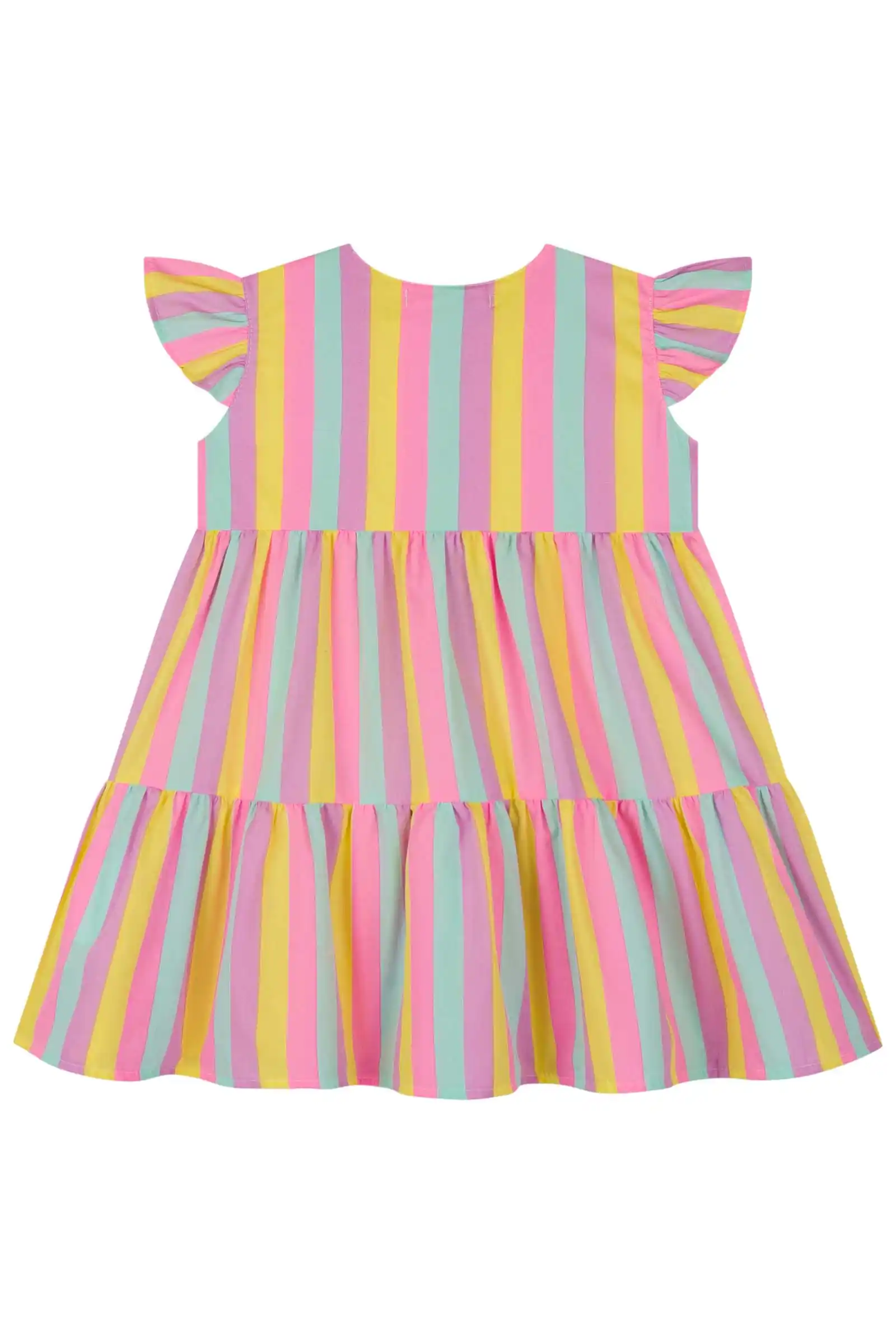 El Vestido Kukie Rayas Multicolor Volantes es pura alegría y estilo para esta temporada. Su diseño de rayas en tonos pastel, junto a las mangas con volantes y la falda con vuelo, lo convierten en una prenda cómoda, fresca y perfecta para el verano.