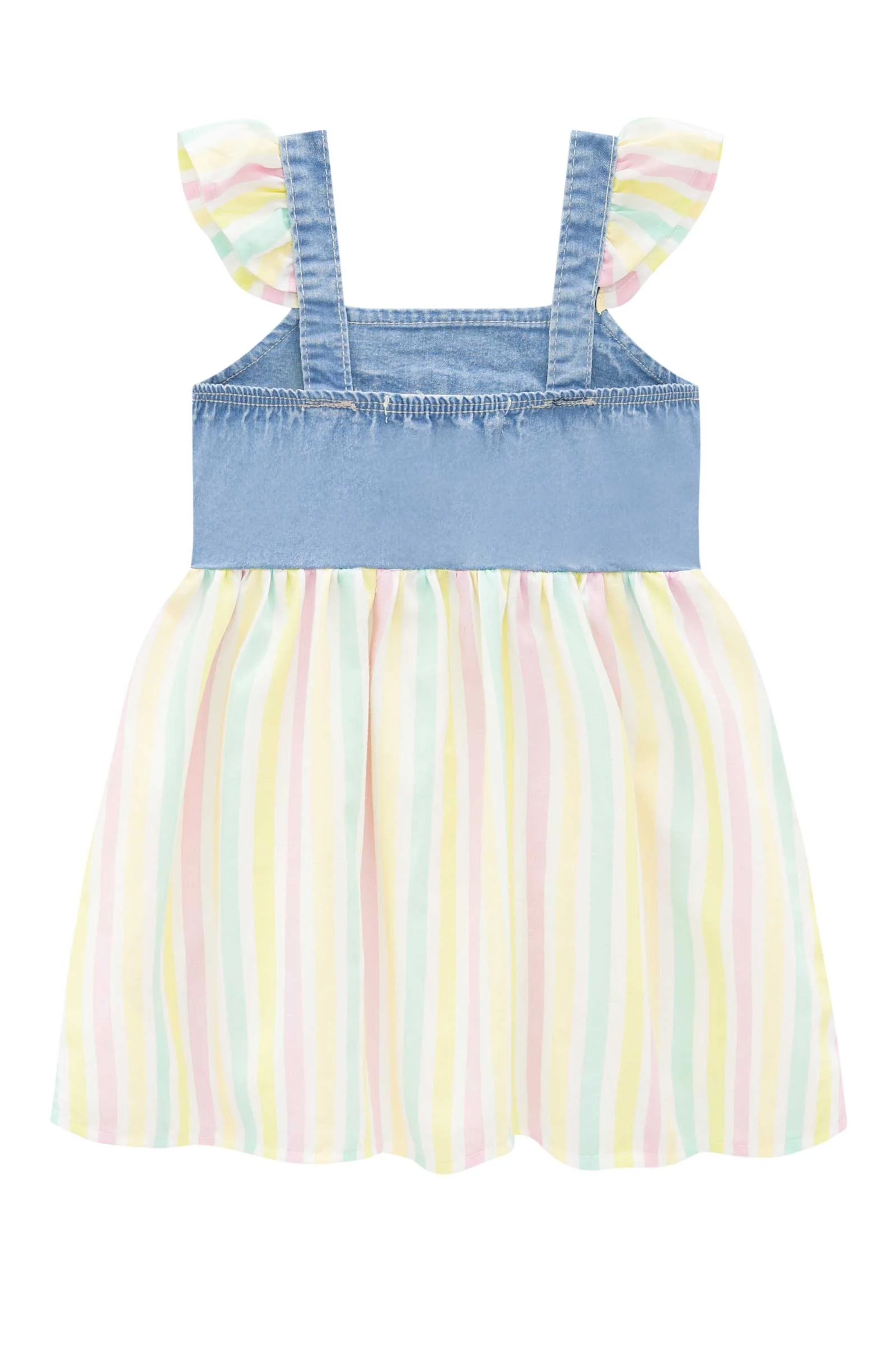 Hermoso vestido Kukie Smile Make Me, ideal para ocasiones especiales o días casuales. Con un diseño encantador que combina un top denim bordado con la frase «Smile Make Me» y una falda de rayas pastel en tonos suaves, este vestido aporta frescura y estilo. Las mangas con volantes completan un look tierno y divertido. Hecho con materiales de alta calidad y confección brasileña, garantiza comodidad y durabilidad. Perfecto para niñas de 2 a 10 años. ¡Un imprescindible en el guardarropa de verano!