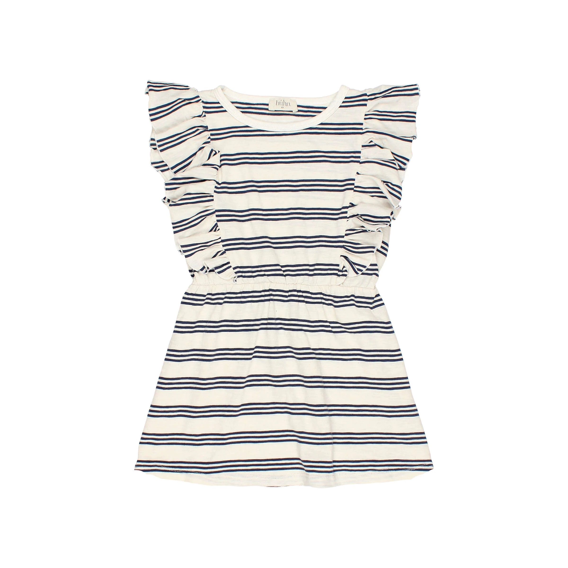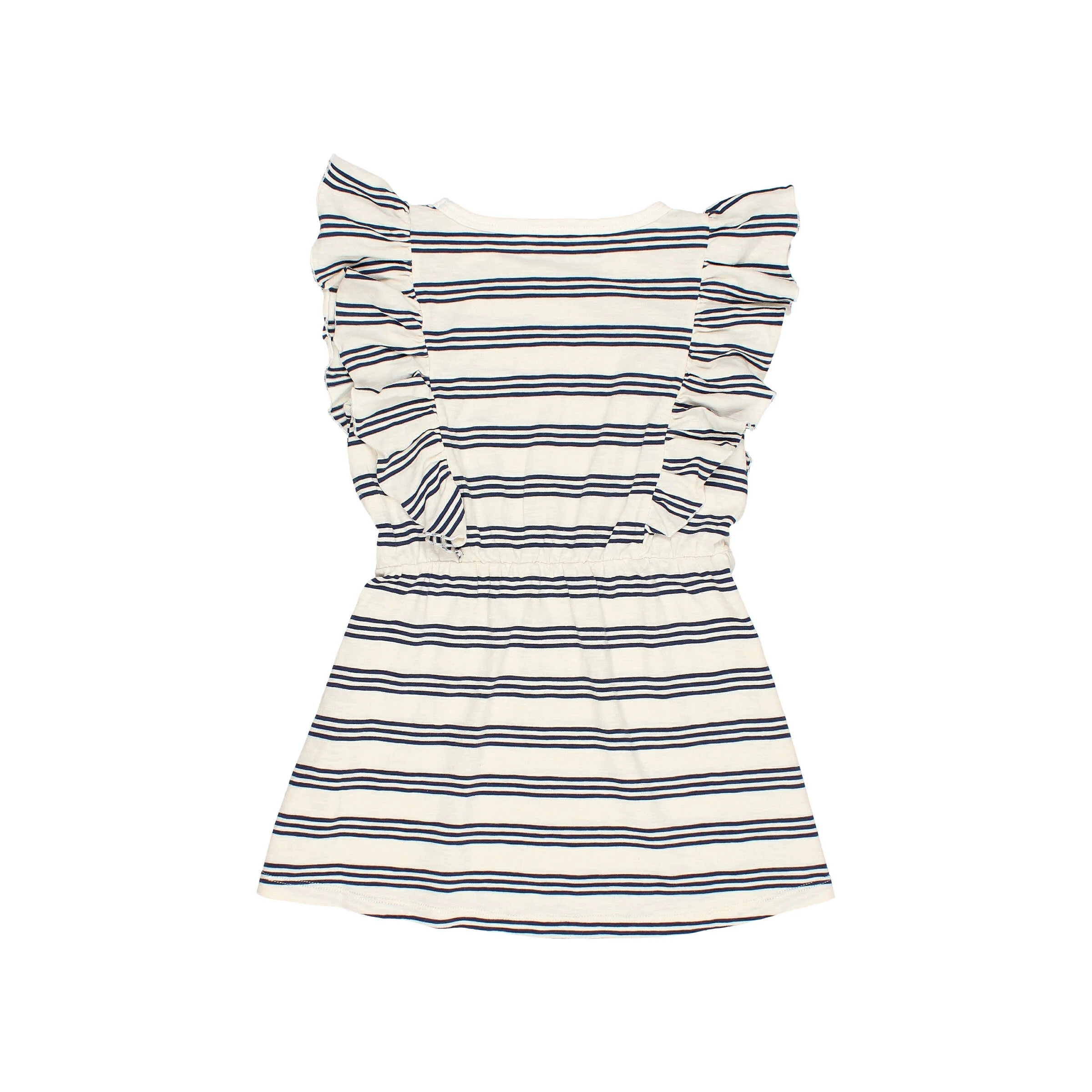 Vestido sin mangas de algodón flamé a rayas. Volantes en la parte superior. Goma elástica en cinturilla.