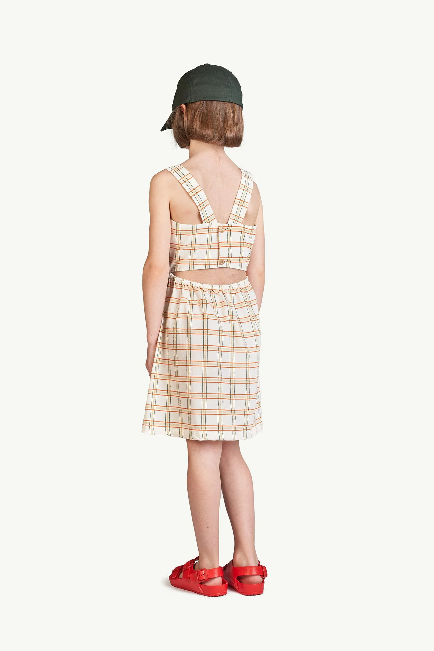 El vestido white squares badger es un vestido de tirantes con la espalda abierta y se cierra con una faja abotonada. Perfecto para la época veraniega e ideal con el patrón Tattersall.